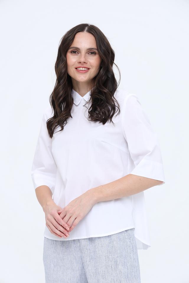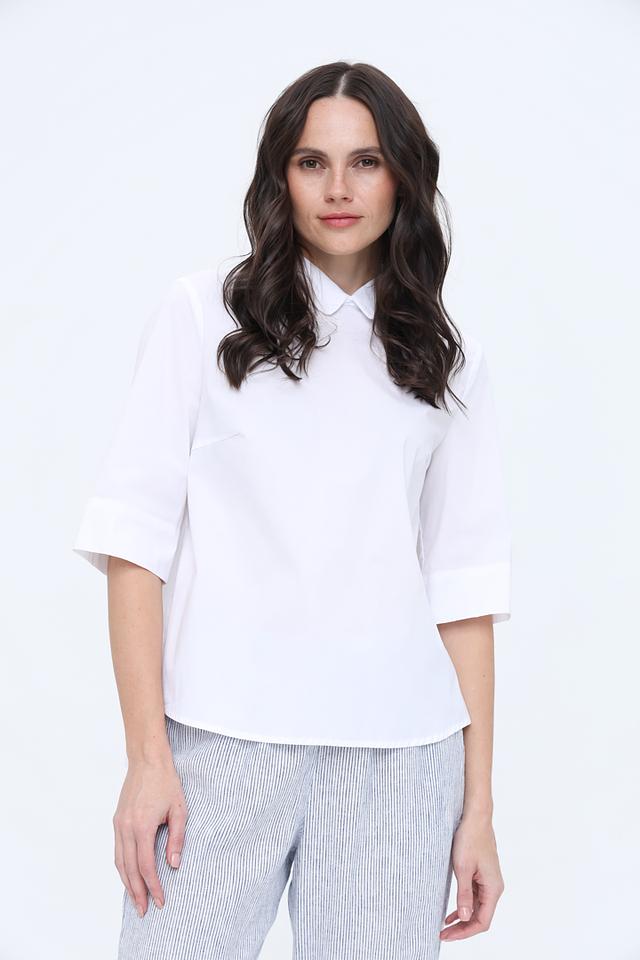 Белая блуза от Oui с воротником-стойкой и рукавами 3/4. Изготовлена из хлопка с добавлением эластана для комфорта и хорошей посадки. Стильный и универсальный выбор для создания элегантных образов. Состав: хлопок 95%, эластан 5%