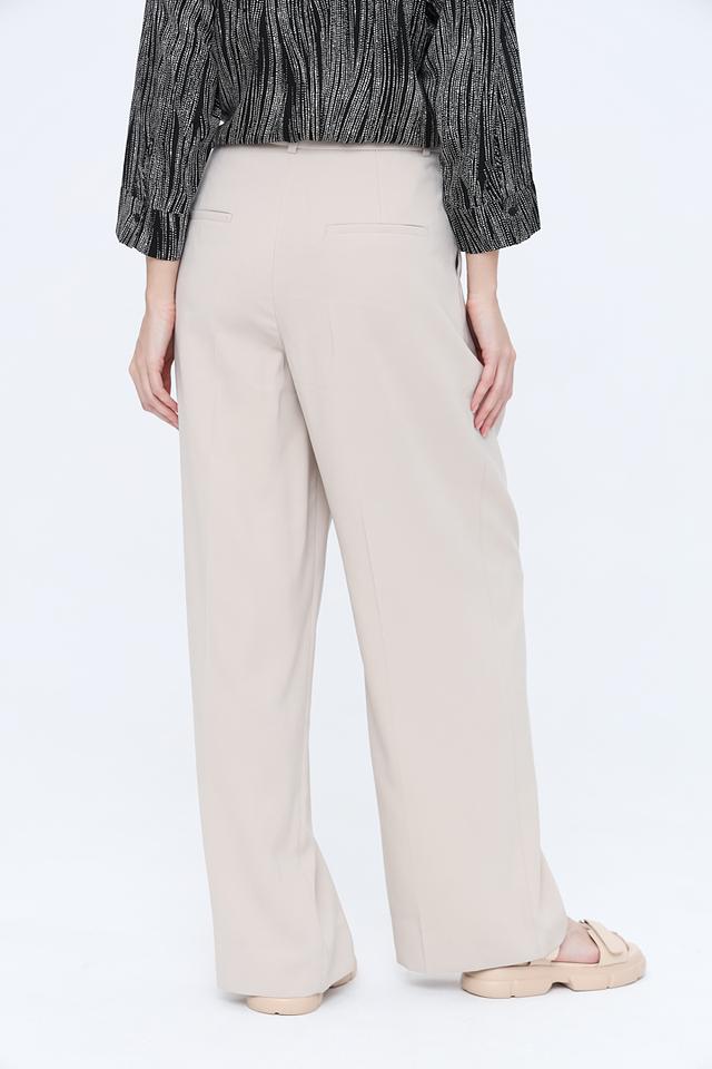 Брюки имеют прямой крой, высокую посадку и широкие штанины, что создает элегантный и современный силуэт. Наличие боковых карманов добавляет практичности. Застежка на молнию и пуговицу обеспечивает надежную фиксацию.