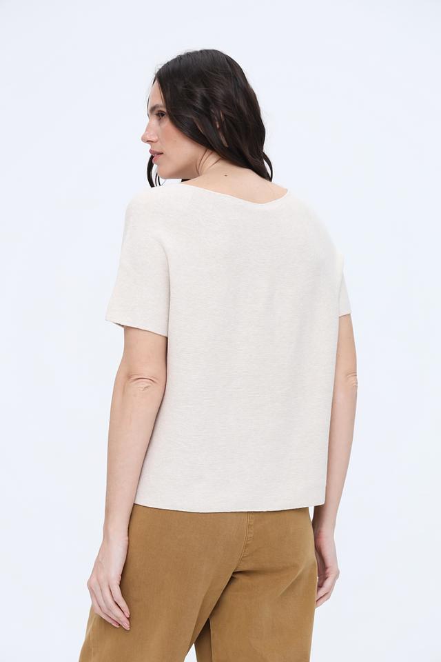 Пуловер имеет прямой крой, короткие рукава и классический круглый вырез горловины. Благодаря своему лаконичному дизайну, он легко сочетается с различными элементами одежды, позволяя создавать разнообразные образы – от повседневных до более элегантных.