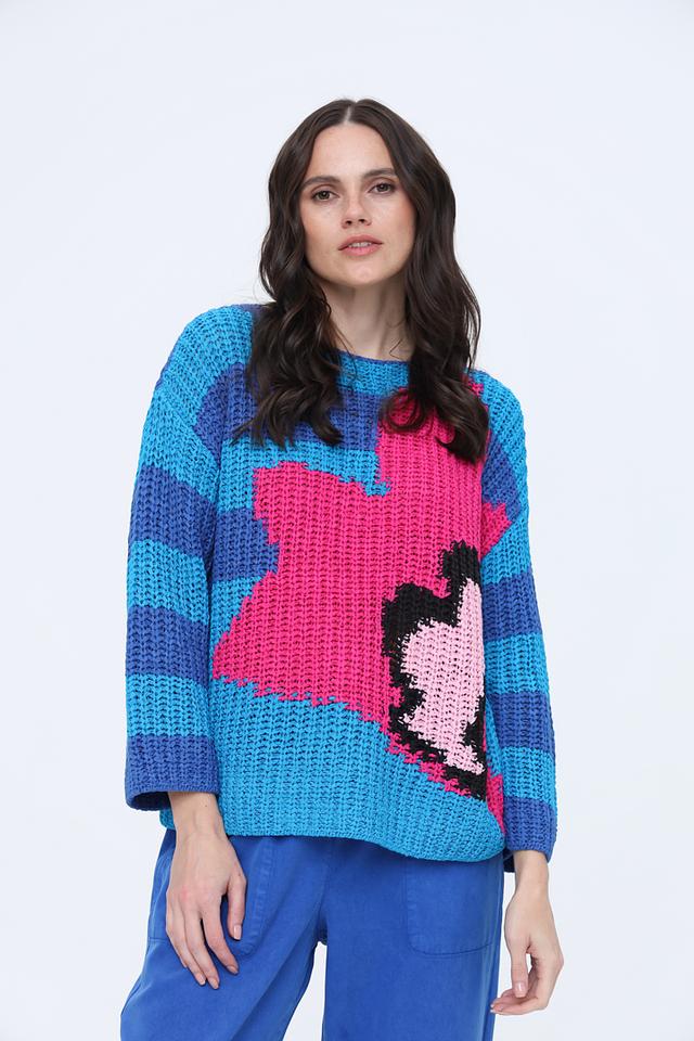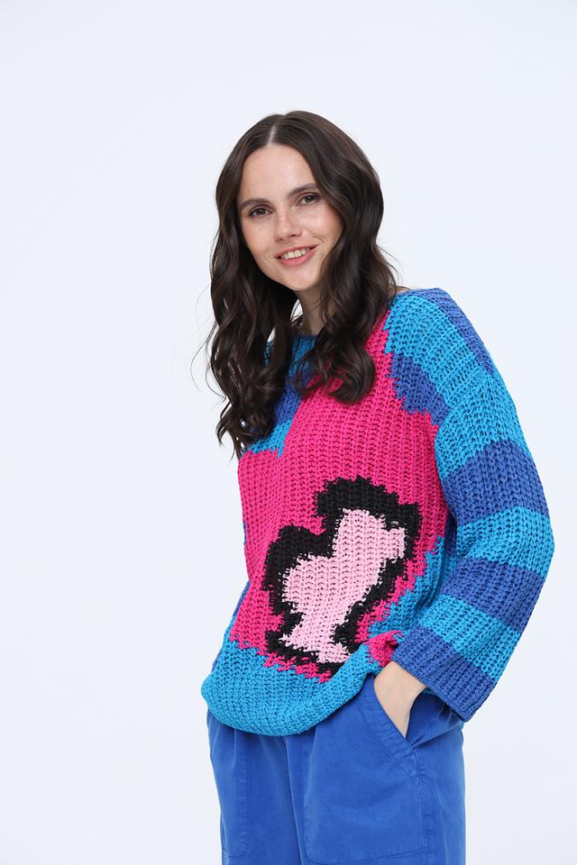 Этот пуловер от бренда Oui – отличный выбор для тех, кто ценит комфорт и оригинальный дизайн. Пуловер выполнен в ярком бирюзовом цвете и украшен крупным узором в виде сердца, выполненным в розовых и фуксиевых тонах.