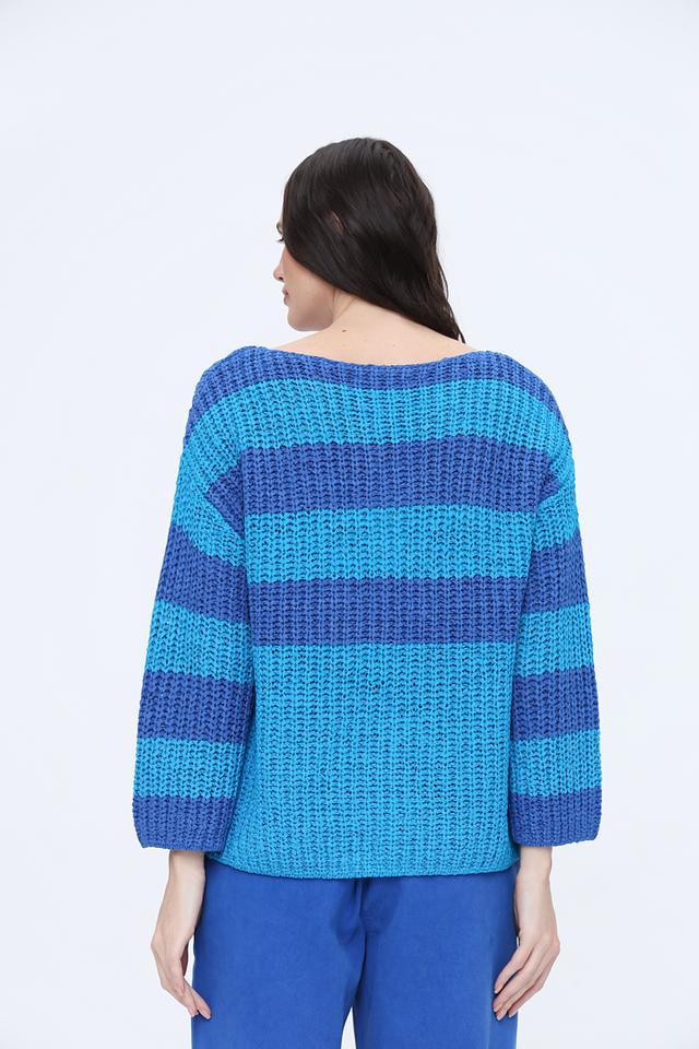 Модель имеет свободный крой и округлый вырез горловины. Рукава – три четверти. Пуловер связан крупной вязкой, что придает ему объем и текстуру.