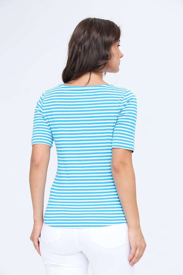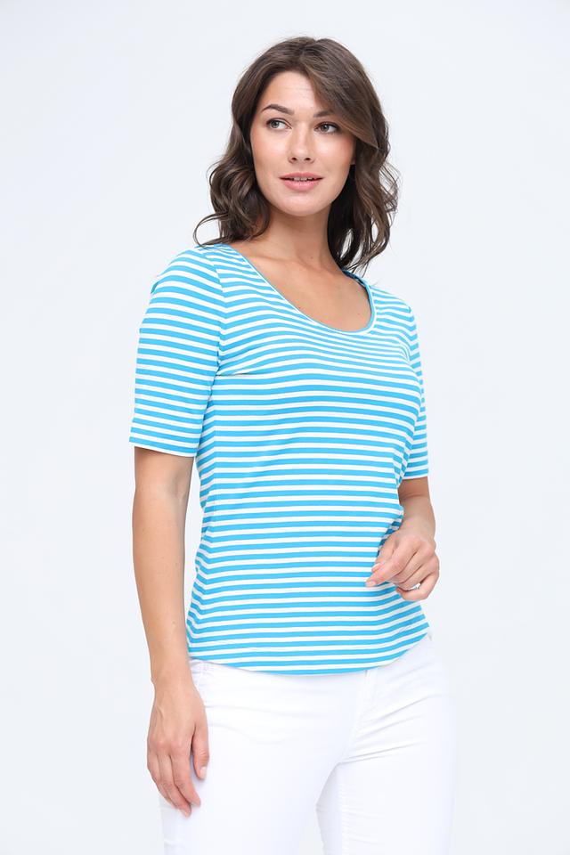 Основной цвет футболки – бирюзовый, дополненный тонкими белыми полосками. Такое сочетание цветов выглядит свежо и легко, идеально подходит для летнего сезона.