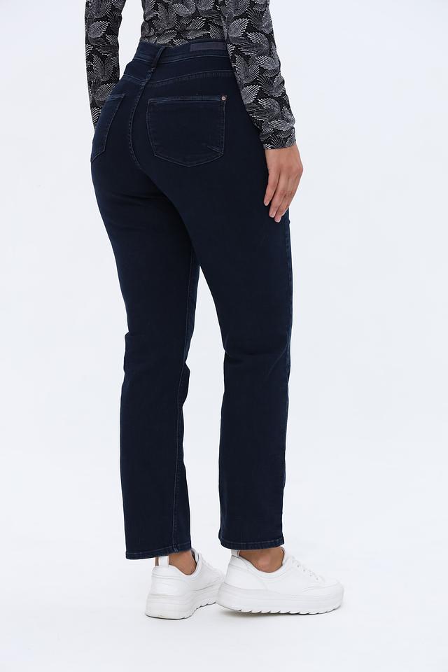 Джинсы имеют высокую посадку и прямой крой, что обеспечивает комфортную посадку по фигуре и визуально вытягивает силуэт. Ткань состоит из 95% хлопка, 3% полиэстера и 2% эластана, что гарантирует мягкость, эластичность и износостойкость.