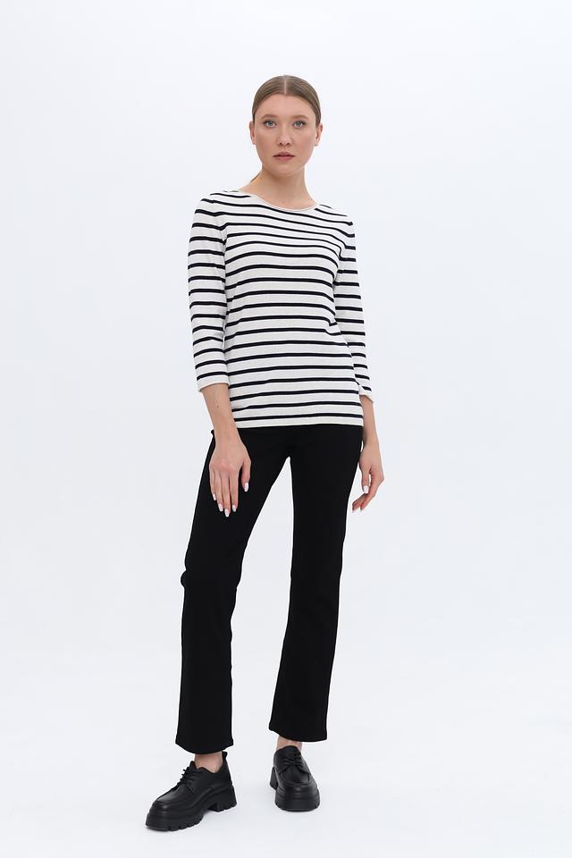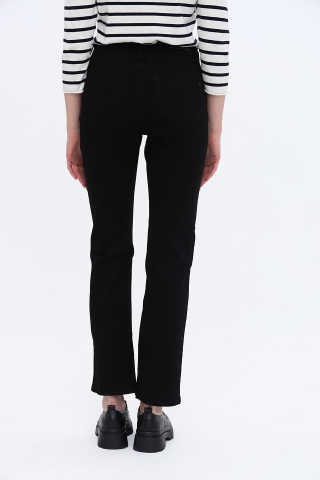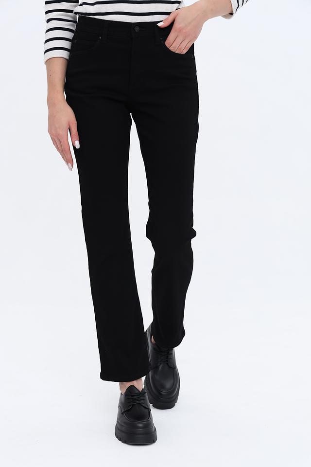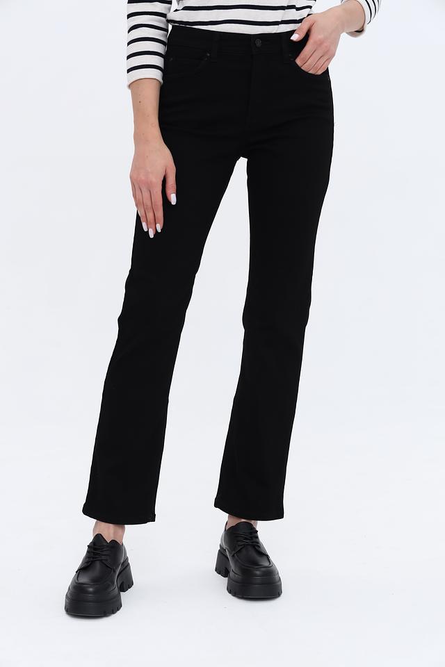 Джинсы имеют прямой крой, обеспечивающий свободу движений и комфортную посадку. Высокая посадка подчеркивает талию и создает элегантный силуэт. Ткань состоит из хлопка, полиэстера, вискозы и эластана, что обеспечивает удобство в носке и сохранение формы.