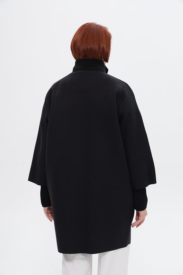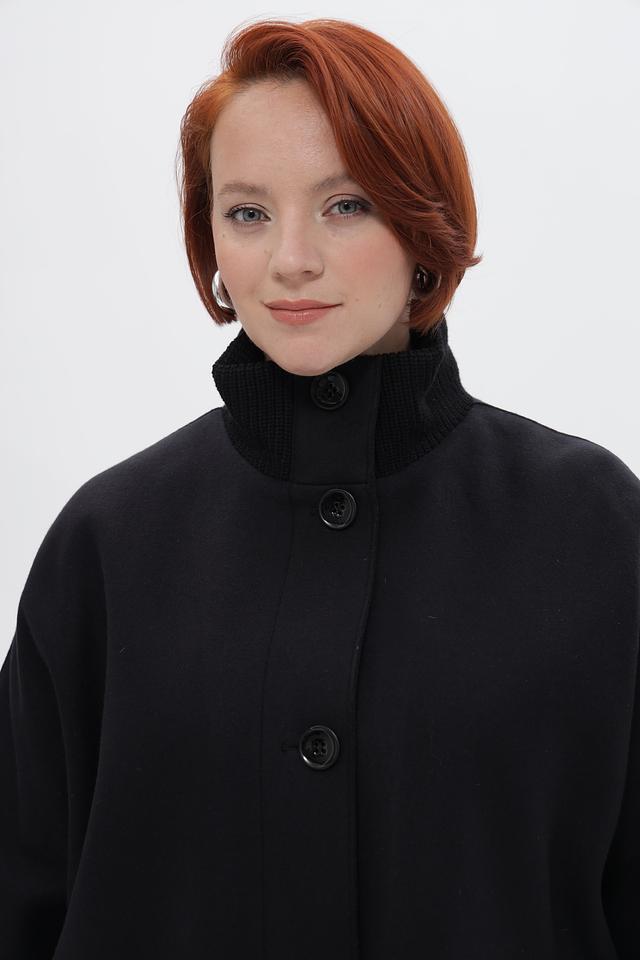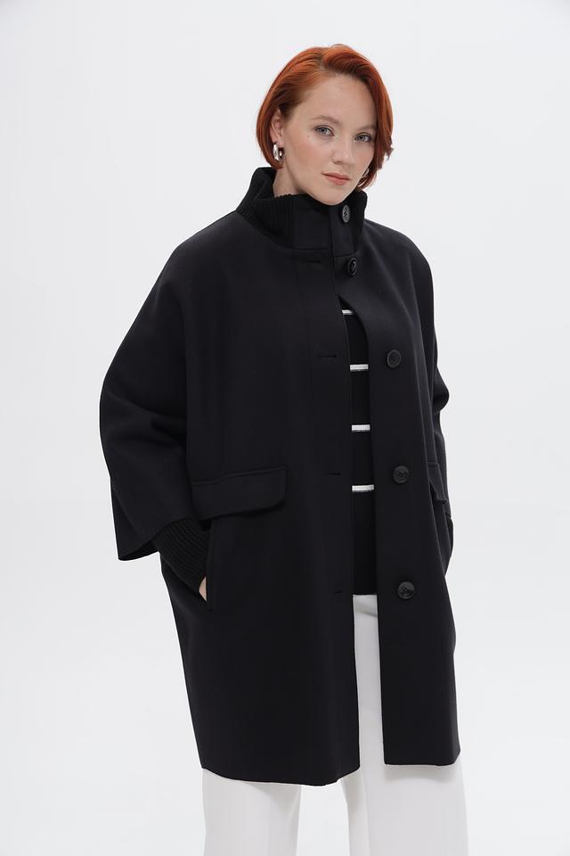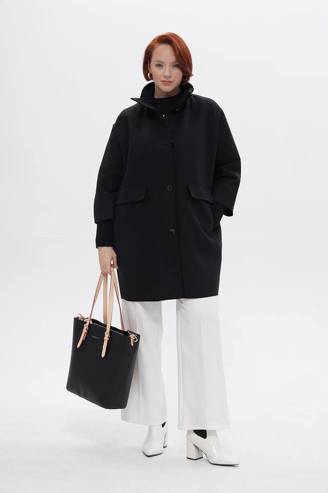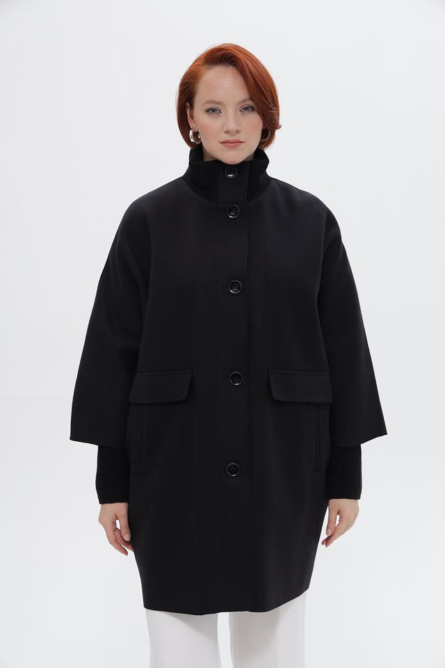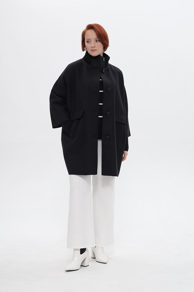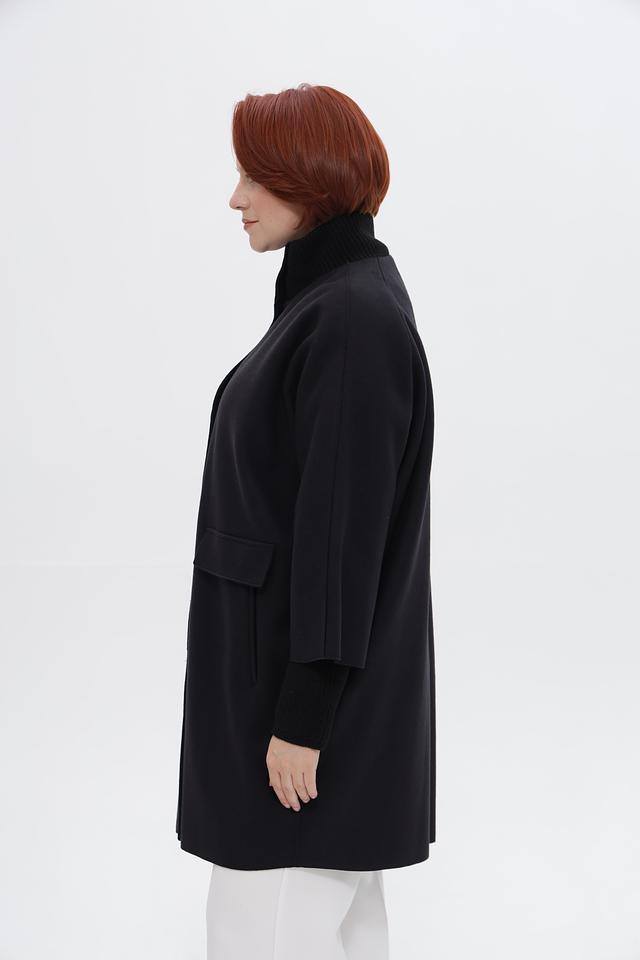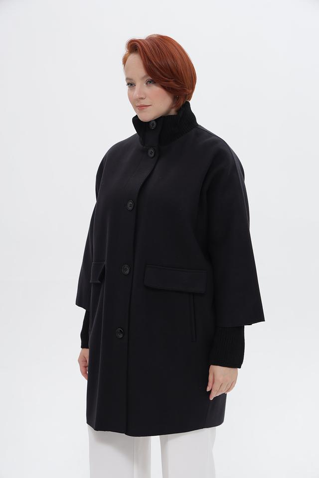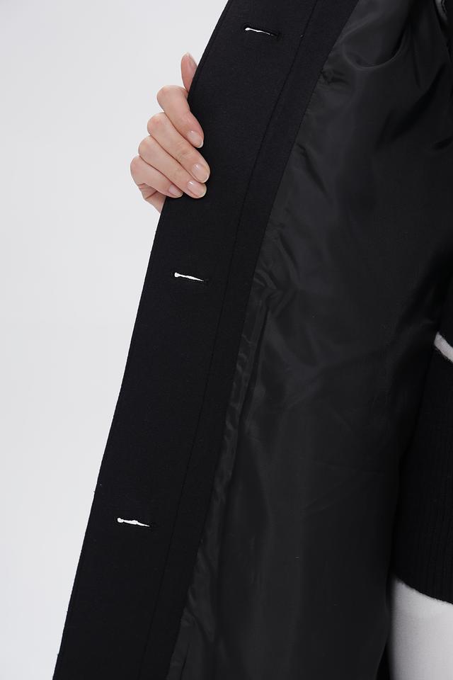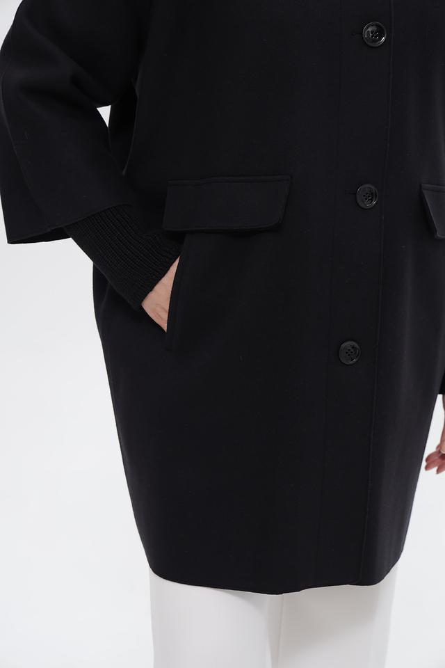 Пальто имеет прямой силуэт и длину до середины бедра. Застежка – ряд пуговиц по центру переда. Накладные карманы добавляют функциональности. Манжеты выполнены из трикотажа, что обеспечивает плотное прилегание к запястьям и защиту от холода.
