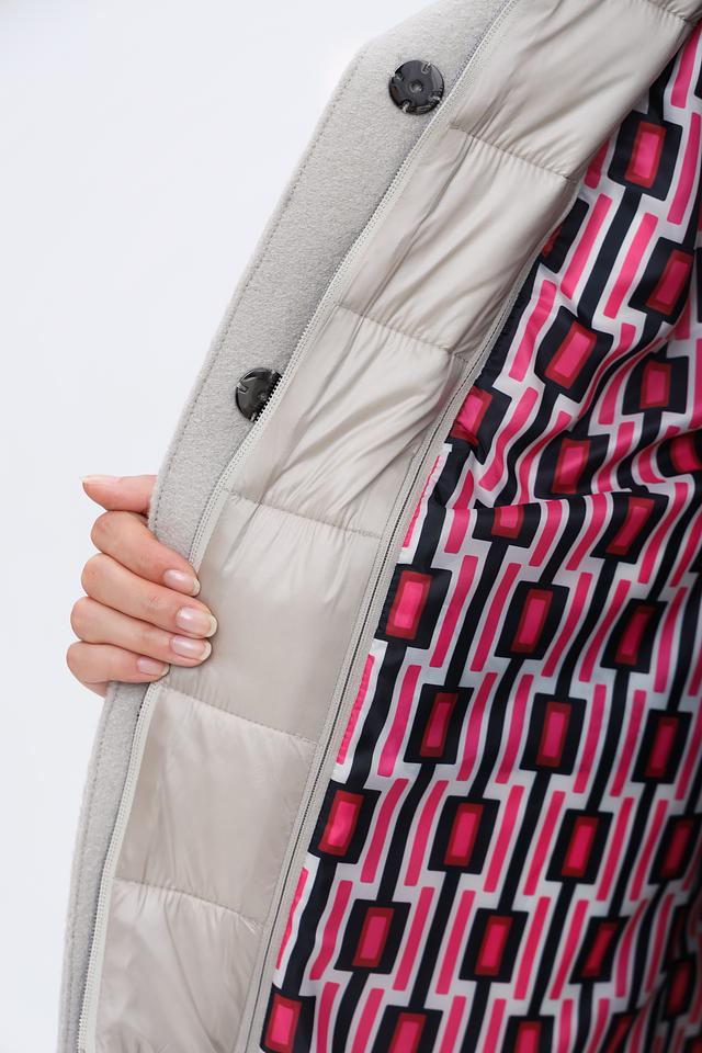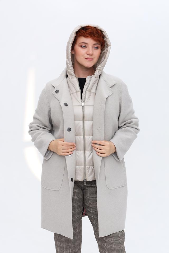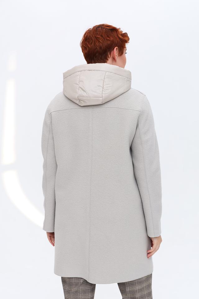 Модель выполнена в спокойном сером цвете, который легко сочетается с другими элементами гардероба. Пальто застегивается на пуговицы, имеет удобный капюшон и практичные боковые карманы.