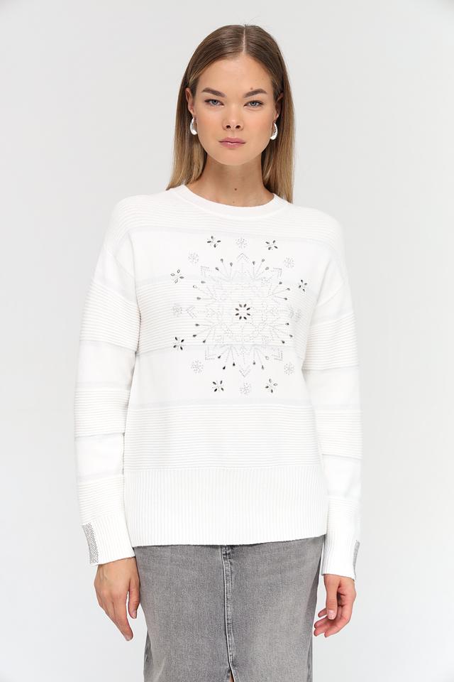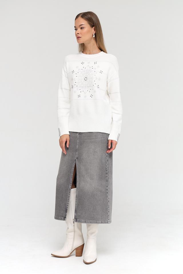 Этот стильный пуловер от Passioni выполнен в белом цвете и украшен изысканной вышивкой, изображающей снежинки. Дизайн модели сочетает в себе уют и элегантность, делая ее идеальным выбором для создания повседневных и праздничных образов.