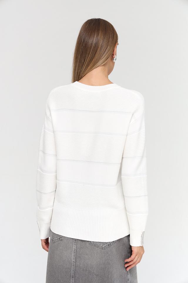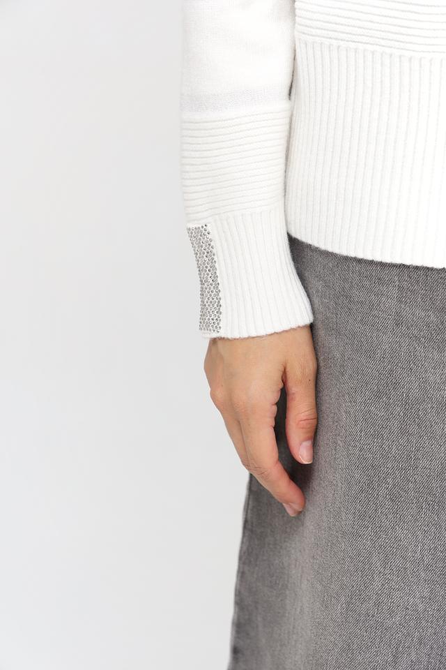 Пуловер имеет свободный крой, который обеспечивает комфортную посадку по фигуре. Длинные рукава и округлый вырез горловины добавляют классические нотки в дизайн. Вышивка выполнена серебристыми нитями, что придает изделию мерцающий эффект.