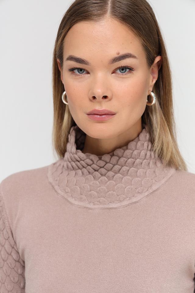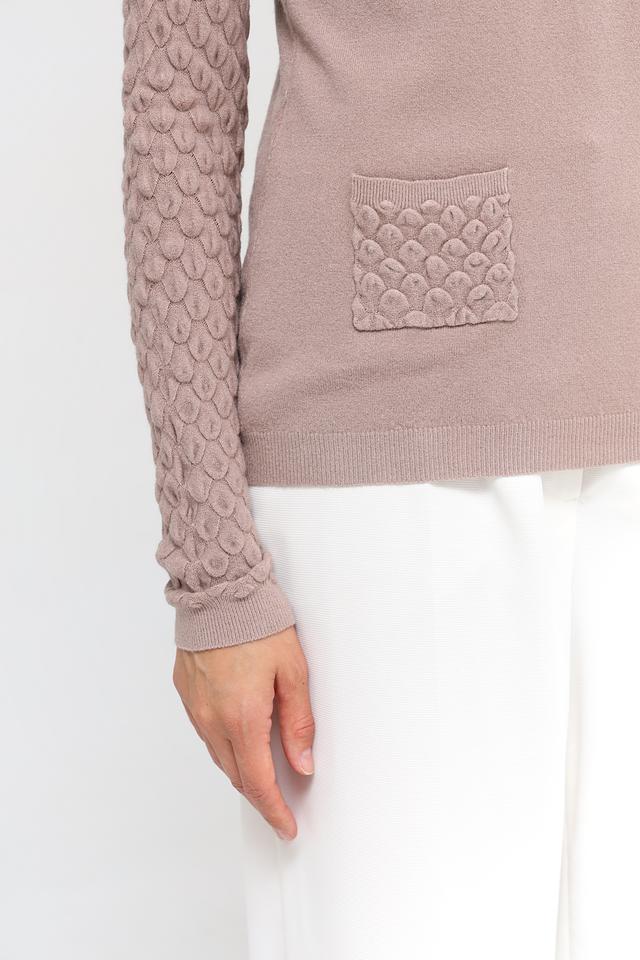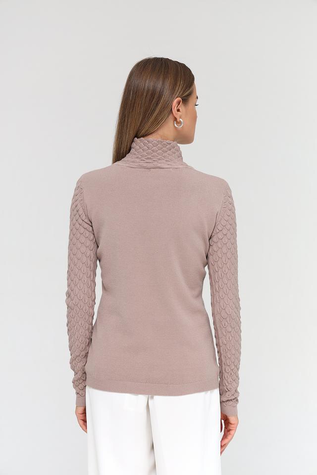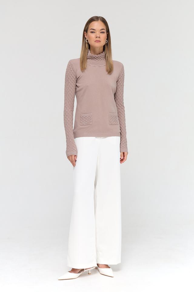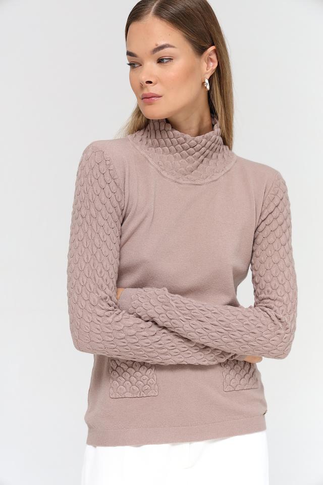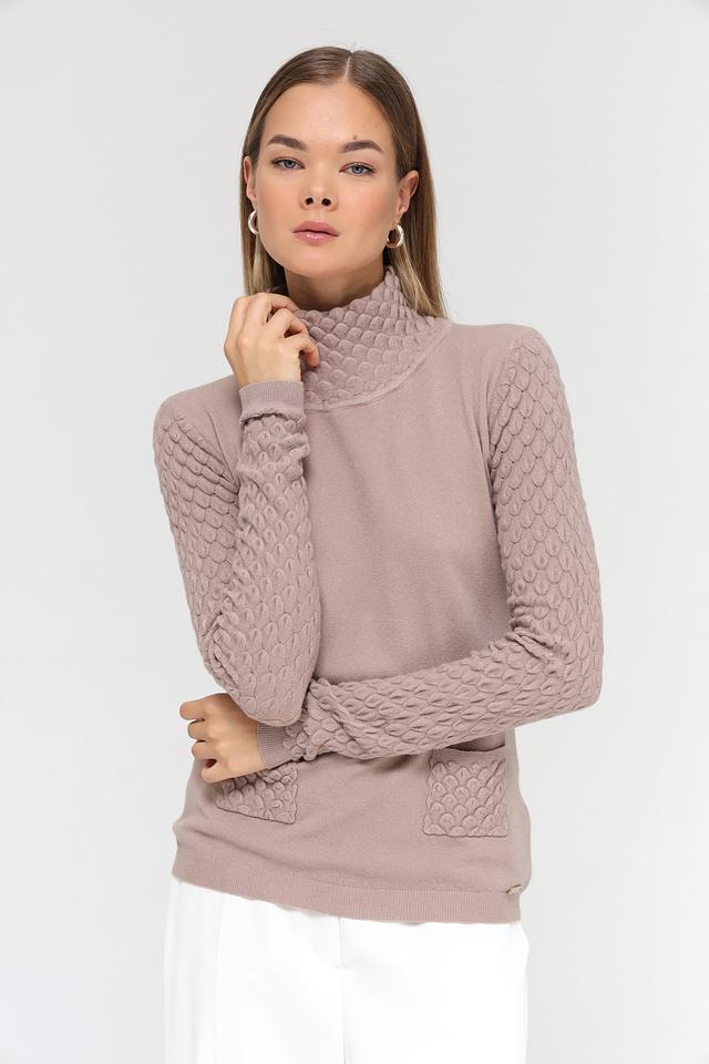 Женский пуловер Passioni нежно-бежевого цвета с высоким горлом и оригинальной текстурой "соты" на рукавах и карманах. Модель выполнена из мягкого и приятного к телу сочетания вискозы и полиамида. Состав: вискоза 55%, полиамид 45%