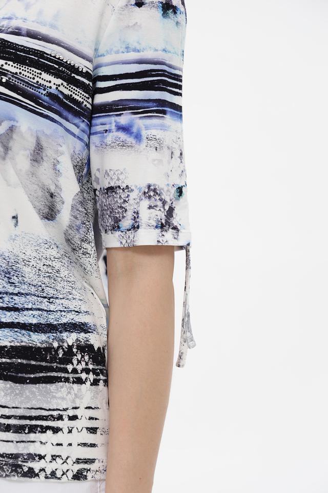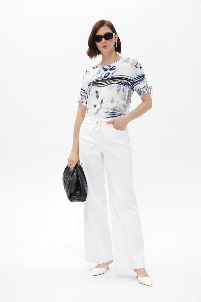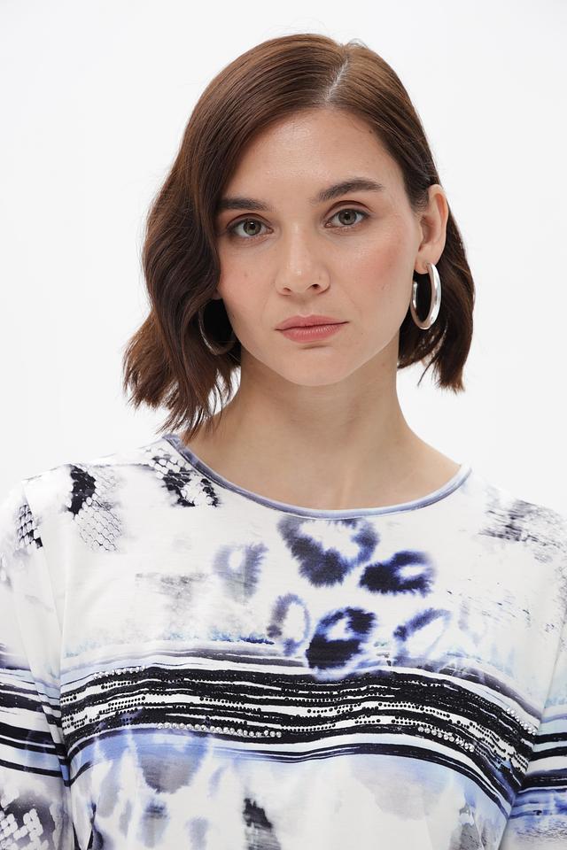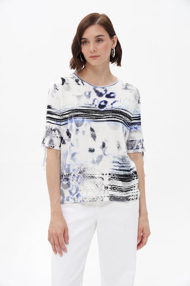 Особенностью данной модели является яркий и необычный абстрактный принт в сине-черных тонах на белом фоне. Футболка имеет прямой крой и короткие рукава, что делает ее универсальной для различных образов.