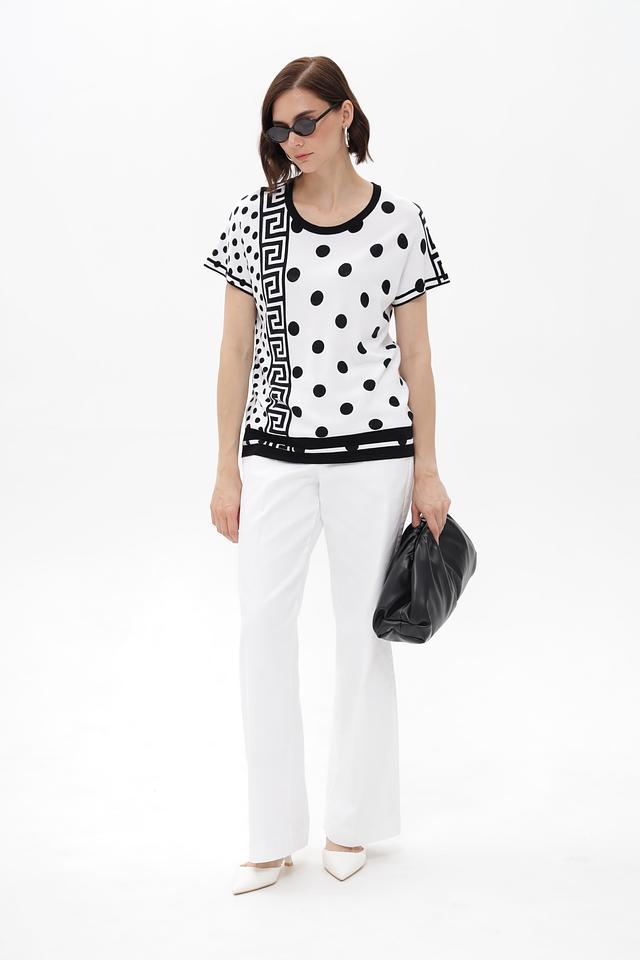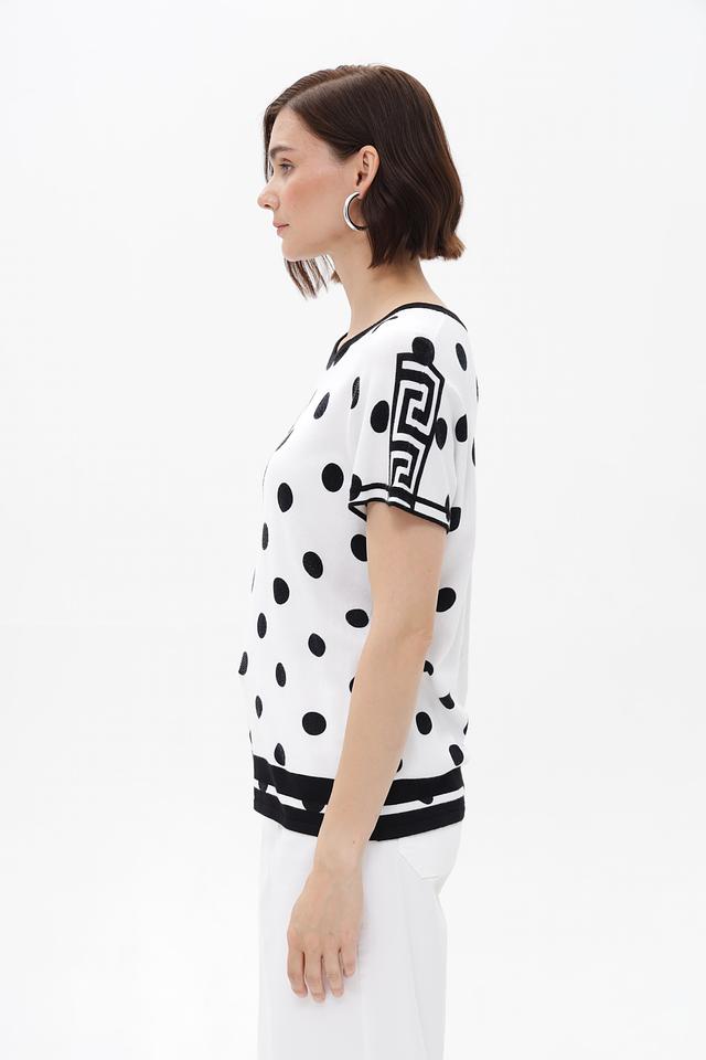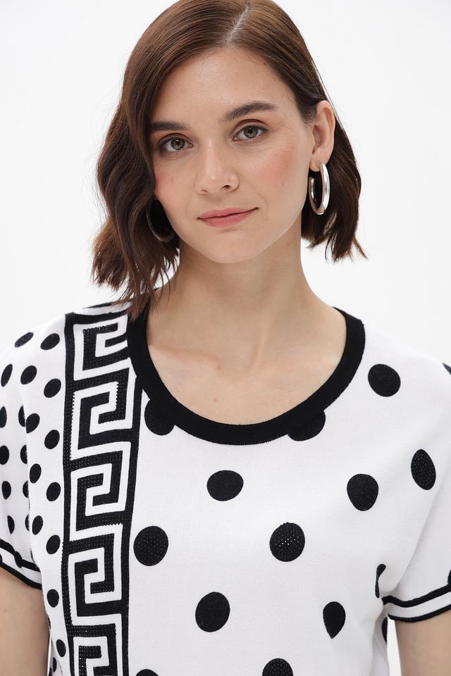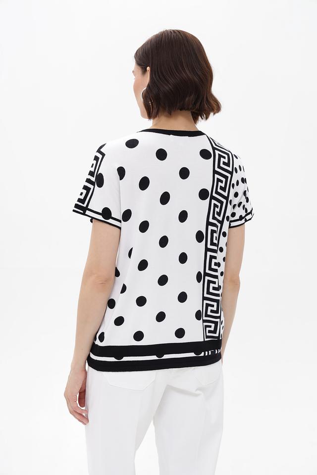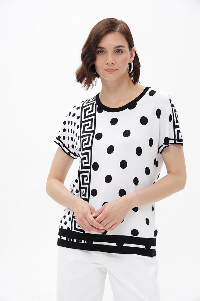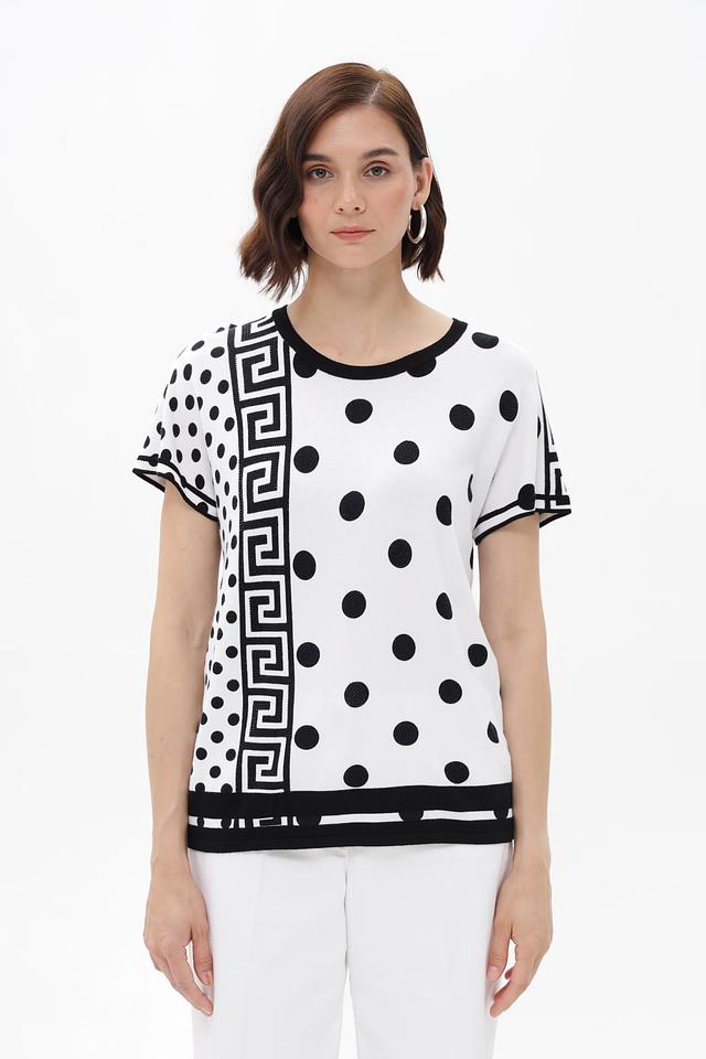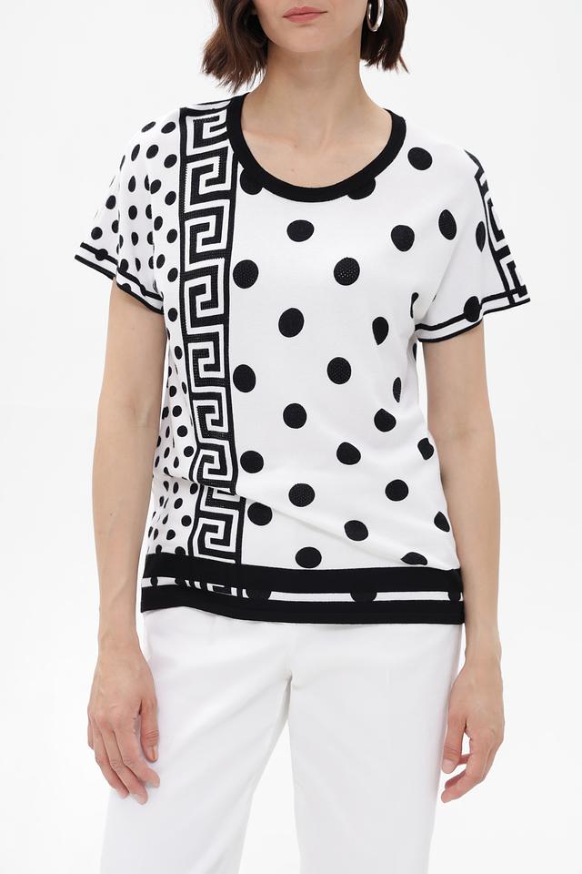 Женский пуловер от бренда Passioni выполнен в белом цвете и украшен эффектным принтом, сочетающим в себе классический горошек и геометрический орнамент.