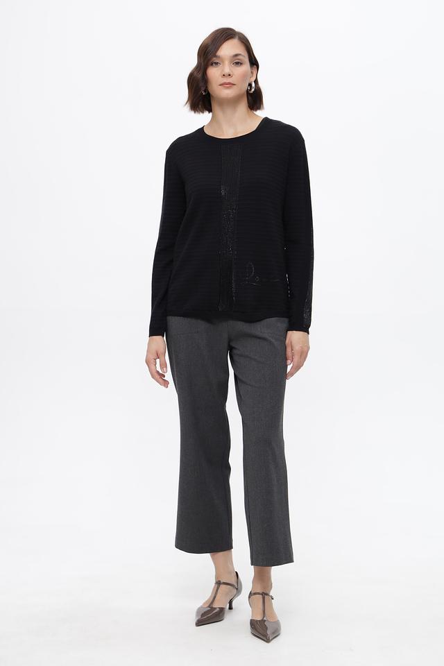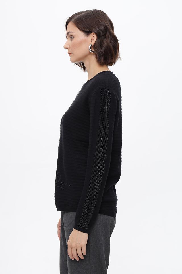 Основной цвет изделия – чёрный, что делает его универсальным дополнением к любому гардеробу. Пуловер украшен вертикальной полосой из сверкающих страз и небольшой надписью “Love”, добавляя изысканности и индивидуальности.