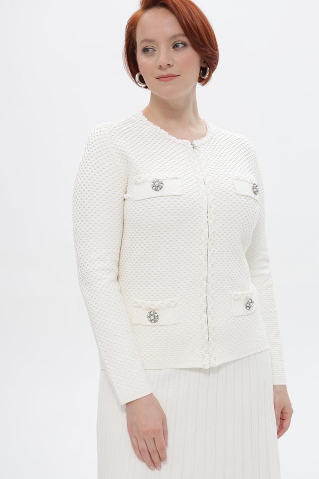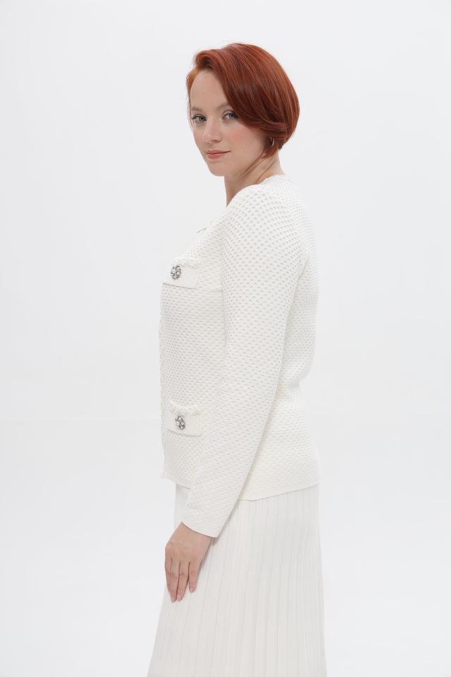 Белый жакет Passioni из фактурного трикотажа с декоративными элементами. Модель на молнии с карманами, украшенными стразами. Идеальное дополнение к вашему образу. Состав: вискоза 80%, полиамид 20%