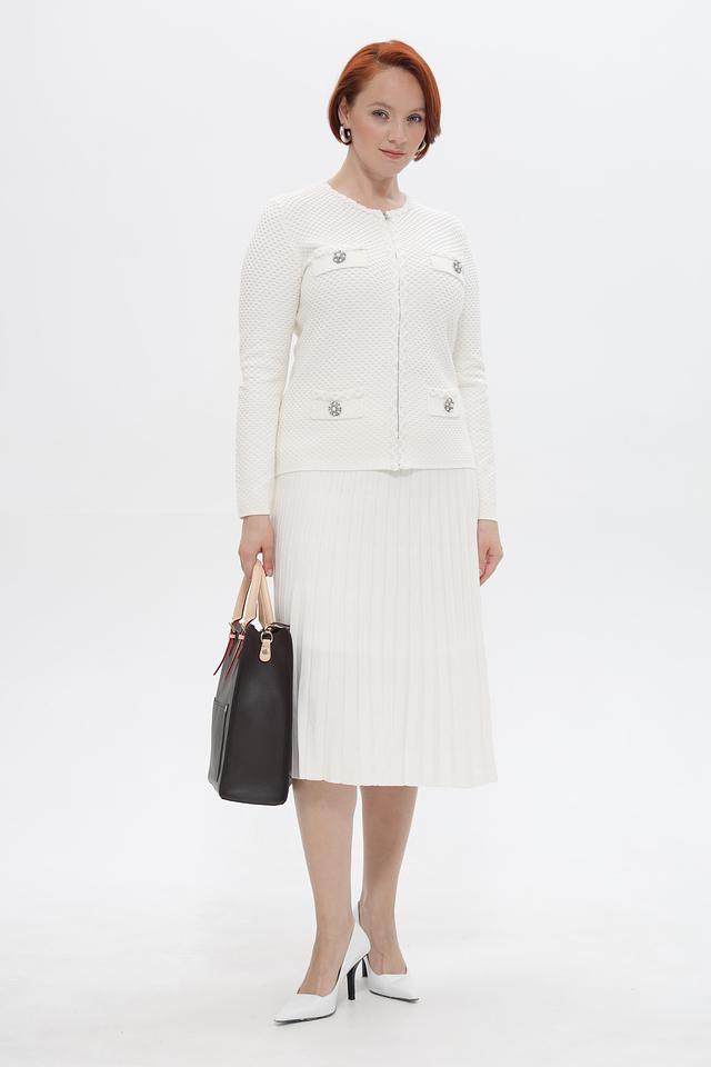 Белый жакет Passioni выполнен из фактурного трикотажа с выразитой плеткой. Модель имеет приталенный силуэт и длину до бедер. Застежка — молния по всей длине. Жакет дополнен двумя накладными карманами с клапанами, декорированными стразами.