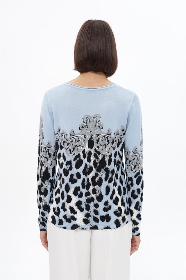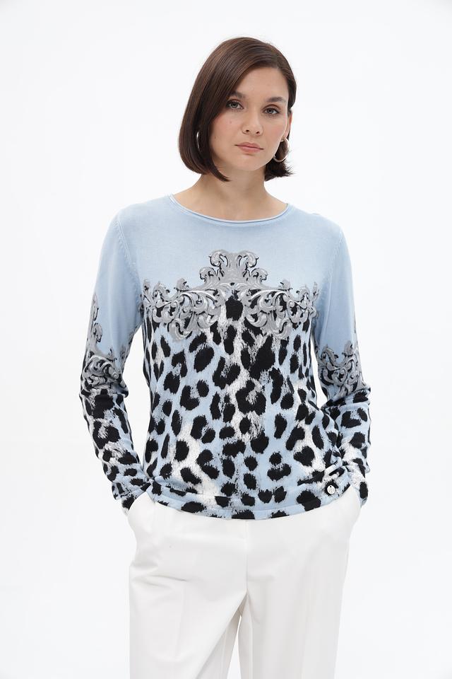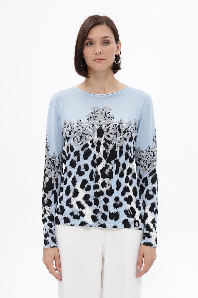 Представляем стильный пуловер от бренда Passioni, выполненный в нежном голубом цвете. Модель украшена ярким принтом, имитирующим леопардовую шкуру, который придает образу динамичность и выразительность.