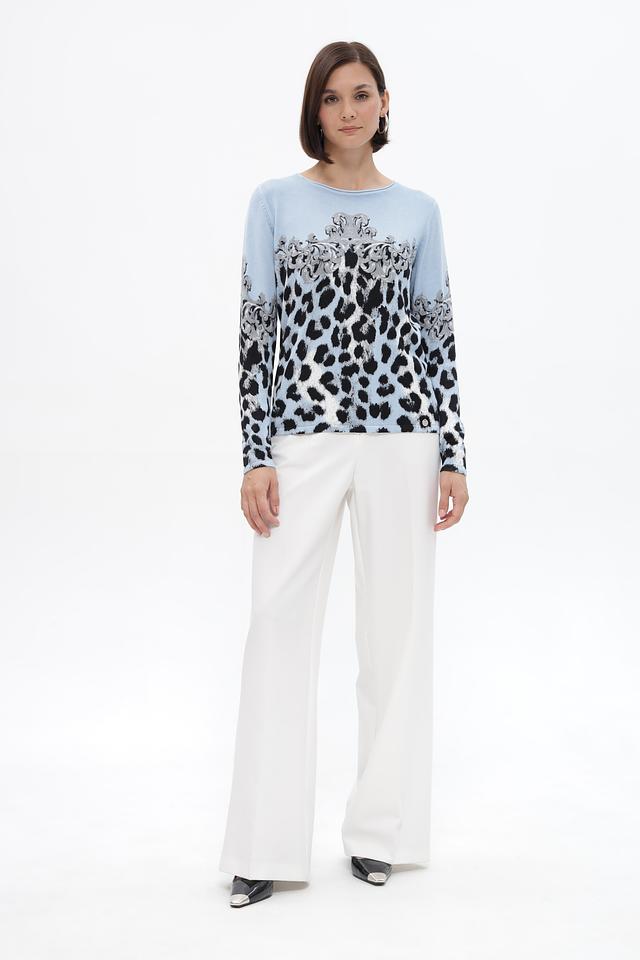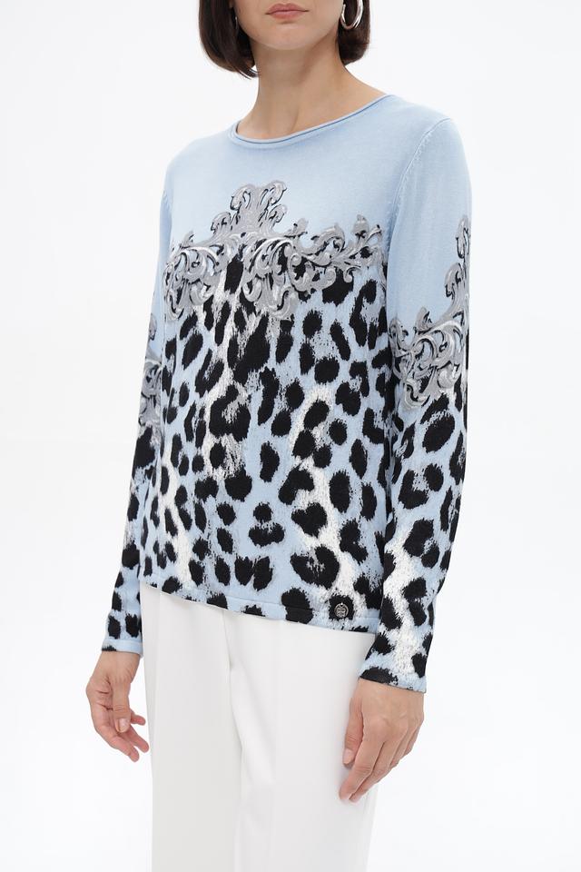 Женский пуловер Passioni голубого цвета с эффектным принтом «леопард» и декоративной отделкой. Изготовлен из мягкой вискозы с добавлением полиамида для комфорта и износостойкости. Состав: вискоза 80%, полиамид 20%