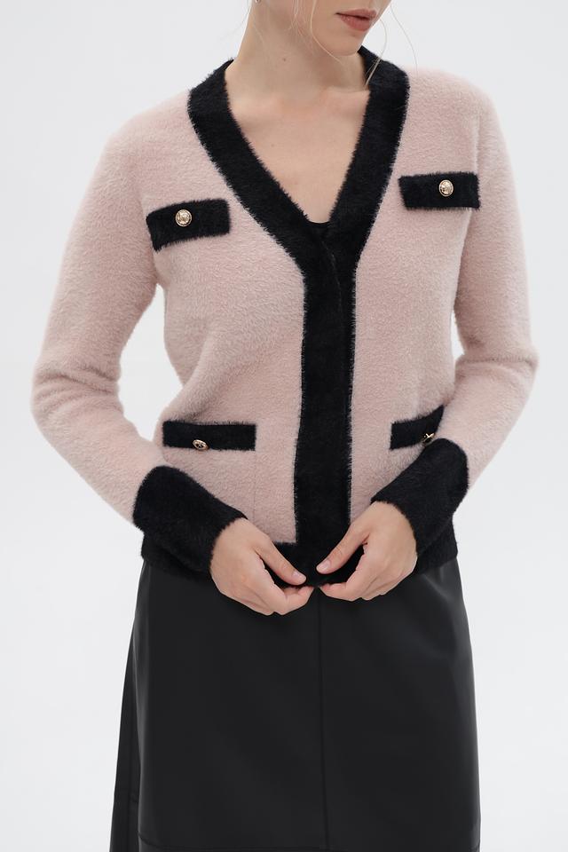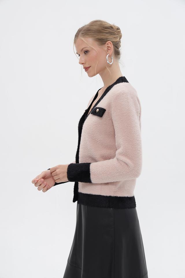 Женский жакет Passioni выполнен в нежном розовом цвете с контрастной чёрной отделкой по краю, горловине и планкам. Модель имеет V-образный вырез и застегивается на декоративные пуговицы золотистого цвета.