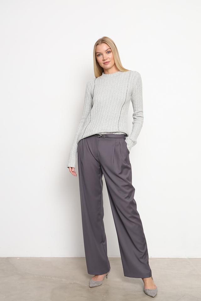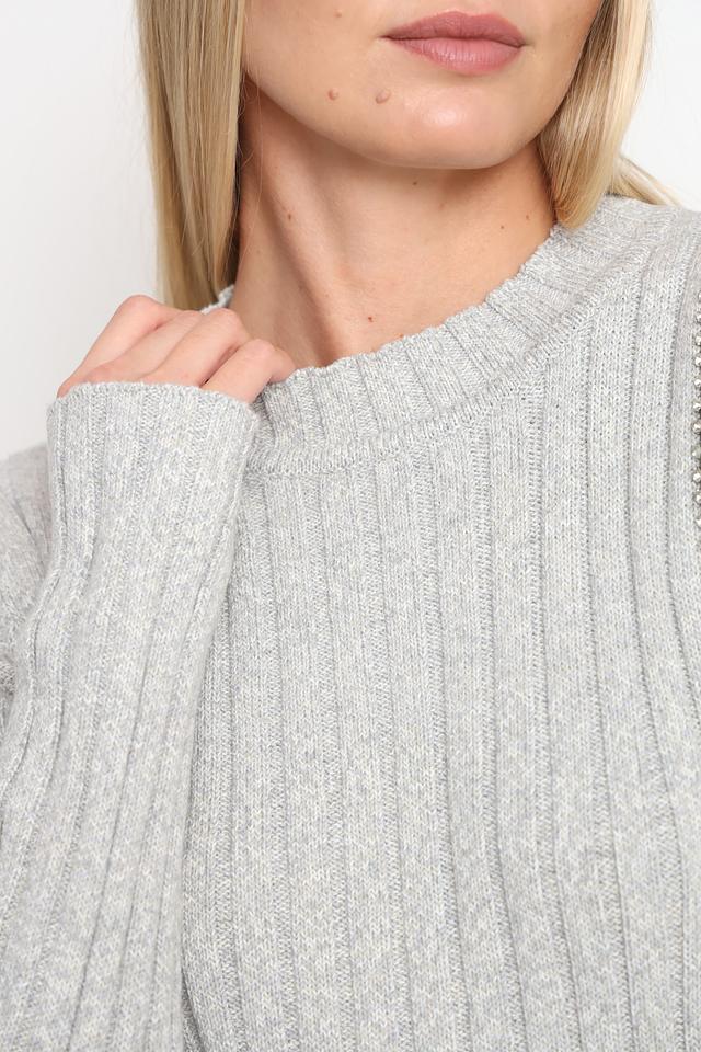 Джемпер имеет классический силуэт с длинными рукавами и округлым вырезом горловины. Особый акцент сделан на декор в виде цепочек, которые расположены по бокам изделия, придавая ему изысканность и оригинальность.