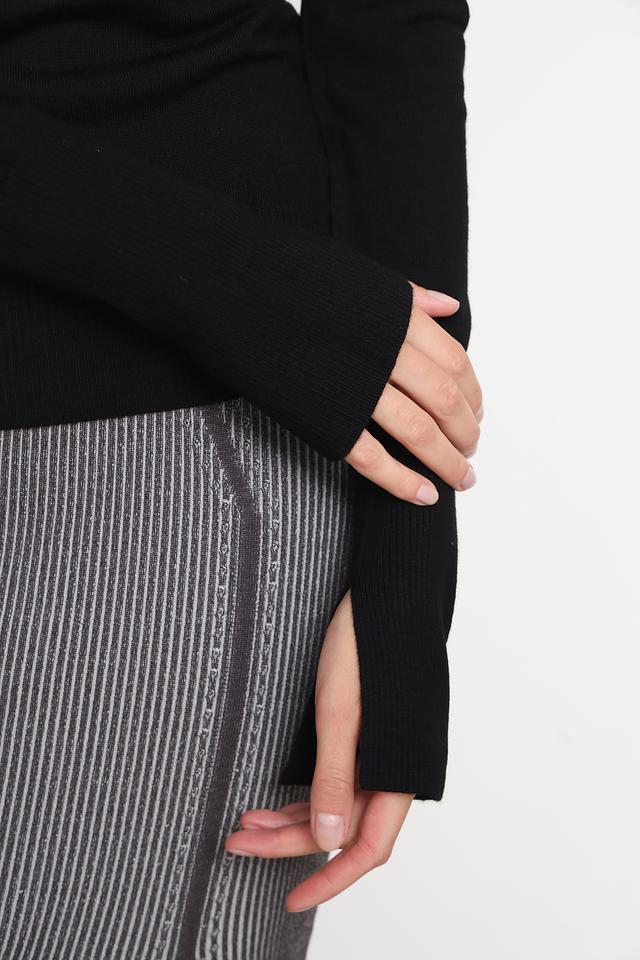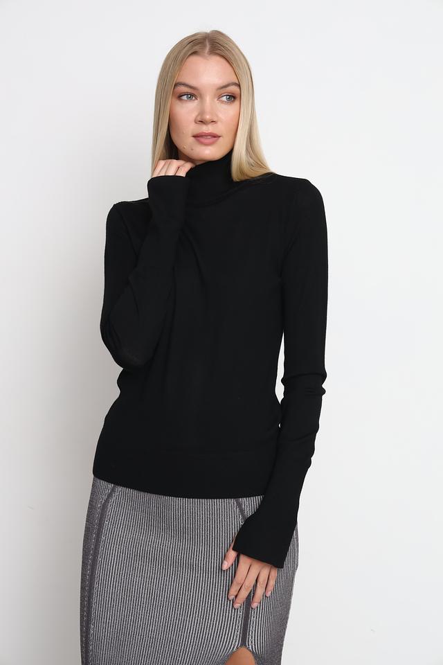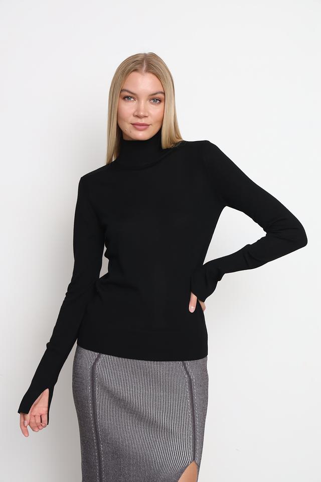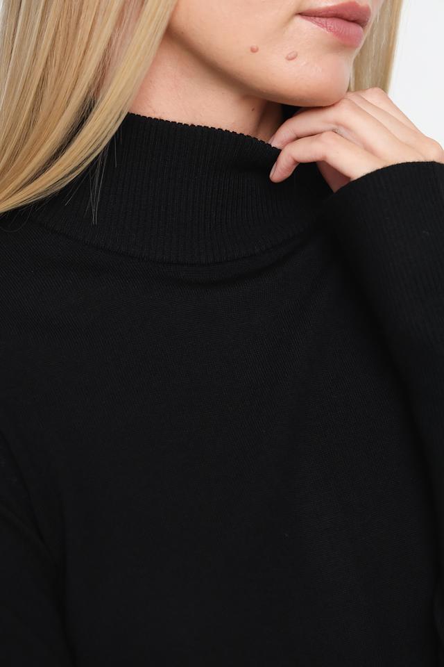 Модель имеет приталенный силуэт, который подчеркивает фигуру, и высокий воротник, добавляющий элегантности. Длинные рукава с аккуратными разрезами в области запястья придают водолазке современный и стильный вид. Тонкая вязка подчеркивает качество материала и обеспечивает комфортную посадку.