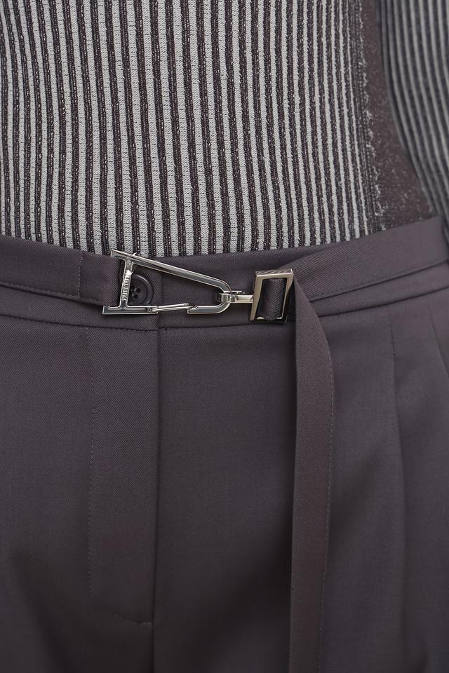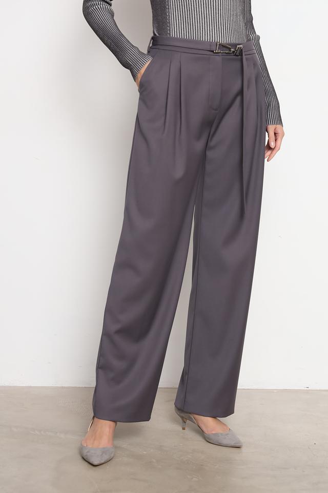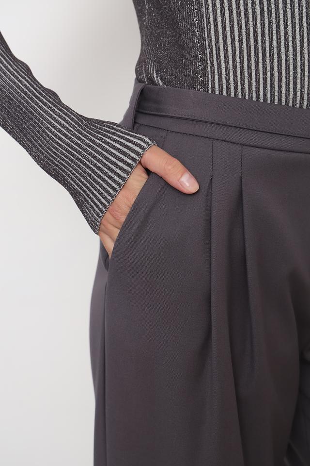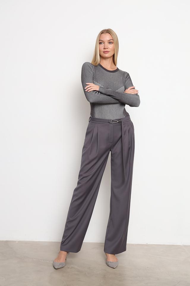 Брюки имеют широкий крой, обеспечивающий свободу движений и создающий современный силуэт. Высокая посадка и пояс с пряжкой подчеркивают талию и добавляют образу изысканности. Передняя часть брюк украшена аккуратными складками, придающими им классический вид.