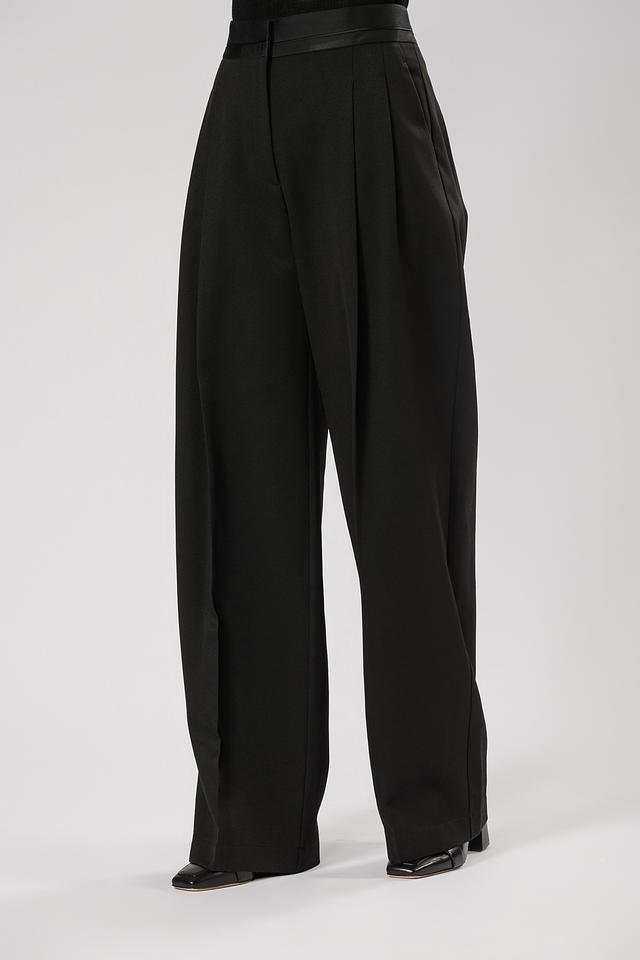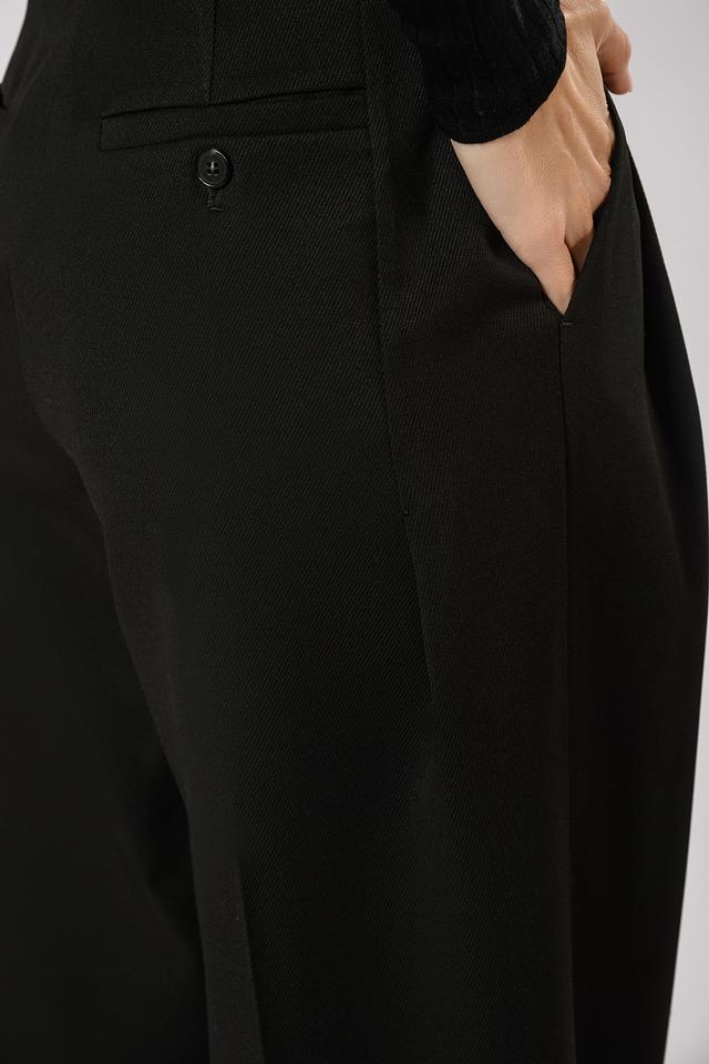 Брюки имеют прямой, широкий крой, который обеспечивает свободу движений и комфорт в течение всего дня. Высокая посадка визуально удлиняет ноги и подчеркивает талию. Передняя часть брюк украшена аккуратными складками, добавляющими образу изысканности.