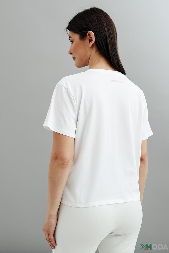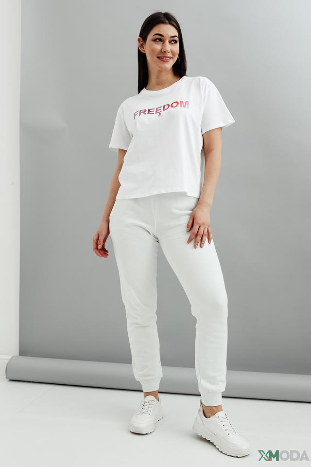 Особенностью данной модели является яркая надпись "FREEDOM", выполненная в розово-фиолетовых тонах на лицевой стороне. Эта деталь придает футболке индивидуальность и выразительность.