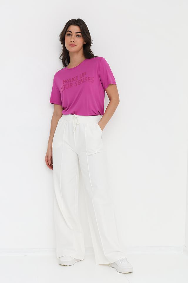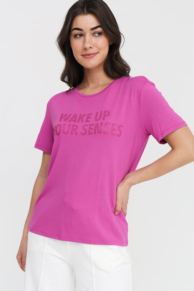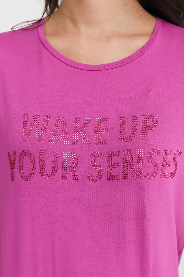 Женская футболка Patrizia Pepe фуксиевого цвета с ярким принтом "WAKE UP YOUR SENSES" станет стильным дополнением к вашему гардеробу. Изготовлена из мягкой вискозы с добавлением эластана для комфорта и отличной посадки. Состав: вискоза 95%, эластан 5%