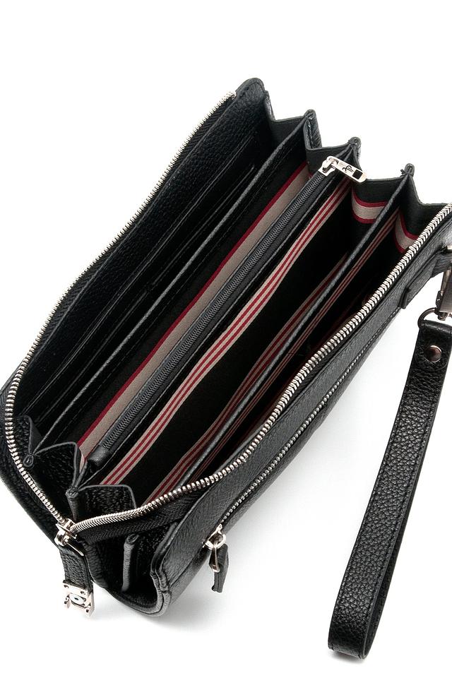 Внутри клатча предусмотрено несколько отделений для удобного размещения банковских карт, документов и других необходимых вещей. Подкладка выполнена из текстиля. Застежка – молния, обеспечивающая надежную защиту содержимого.