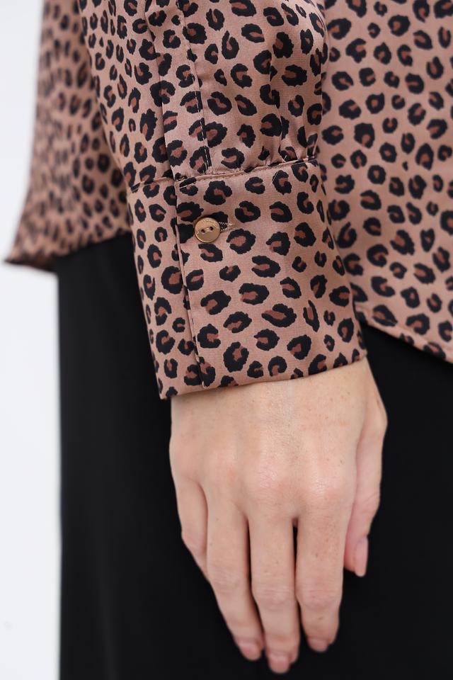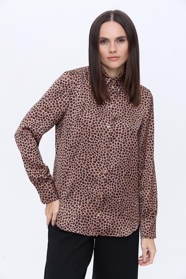 Рубашка имеет классический крой с длинными рукавами и отложным воротником. Застежка на пуговицах обеспечивает удобство ношения. Привлекательный леопардовый принт делает эту модель особенной и позволяет создавать запоминающиеся луки.