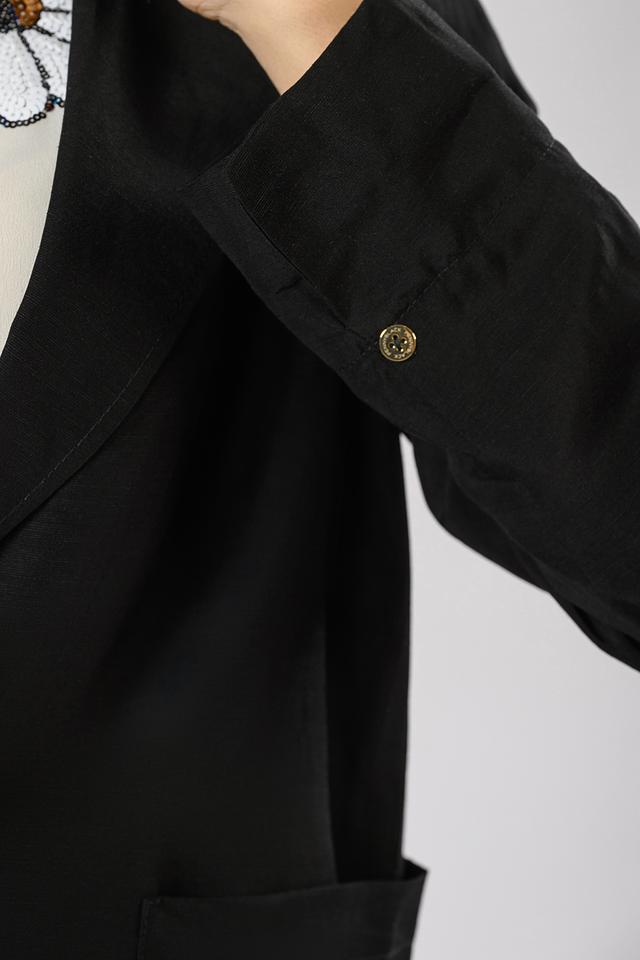 Жакет выполнен из качественной вискозы и льна, что обеспечивает приятные тактильные ощущения и комфорт в носке. Ткань хорошо держит форму и не мнется.