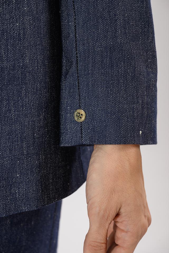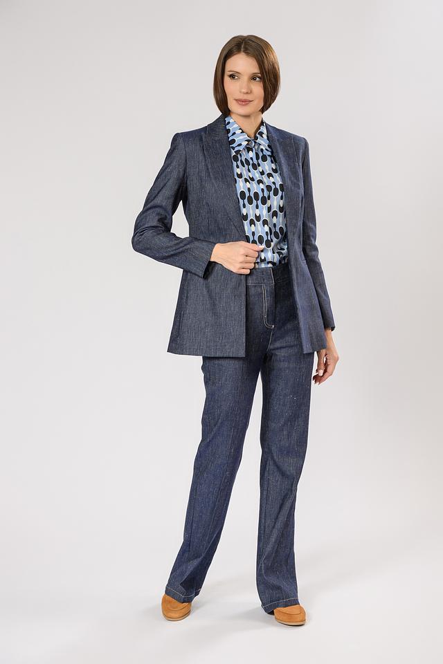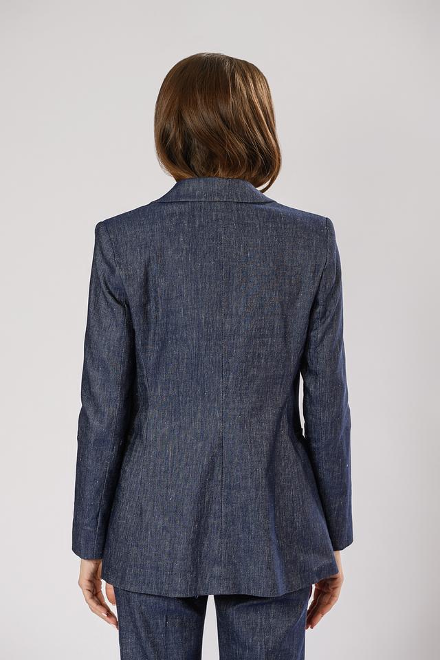 Жакет имеет прямой крой, лацканы и длинные рукава с декоративными пуговицами. Застежка – на одну пуговицу. Текстура ткани напоминает деним, что придает жакету современный и непринужденный вид.