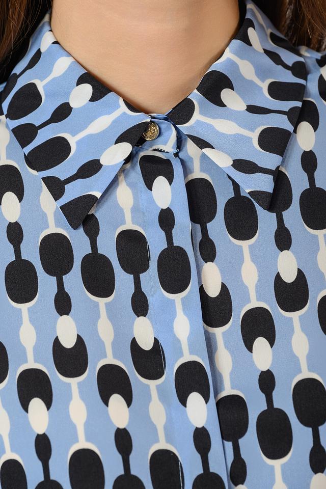 Модель имеет классический крой с длинными рукавами и отложным воротником. Застежка на пуговицы добавляет функциональности и позволяет регулировать степень прилегания. Блуза изготовлена из высококачественного полиэстера, который приятен к телу и не требует сложного ухода.