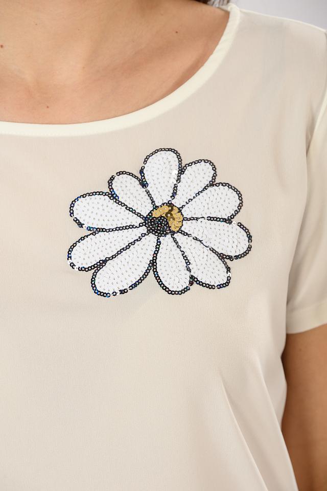 Футболка имеет прямой крой, короткий рукав и округлый вырез горловины. Главной особенностью модели является вышивка в виде цветка на груди, которая придает ей женственность и оригинальность.