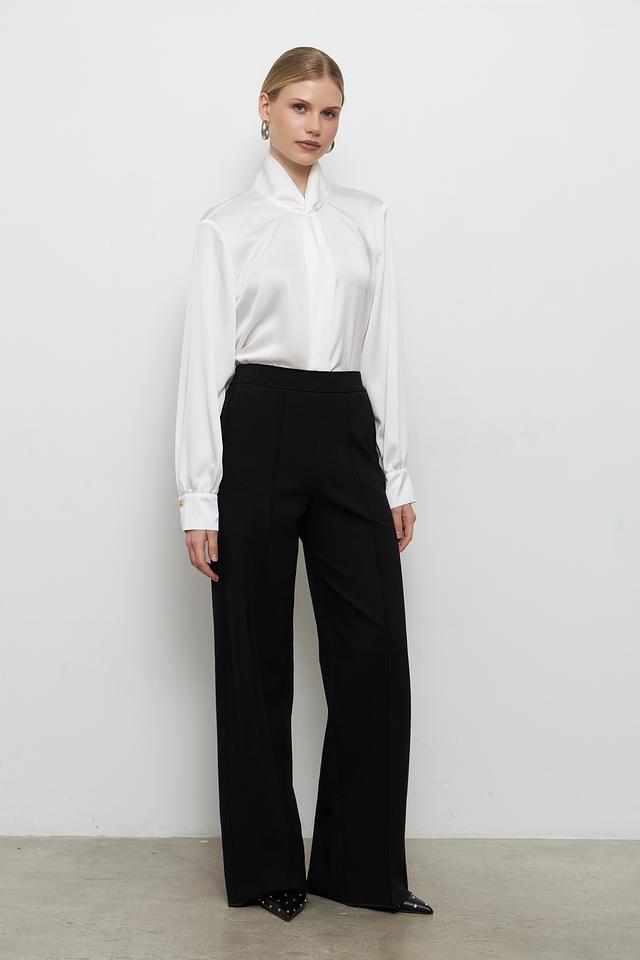 Брюки имеют прямой крой и широкие штанины, создающие элегантный и современный силуэт. Высокая посадка визуально удлиняет ноги и подчеркивает талию. Материал – сочетание вискозы (65%), полиамида (30%) и эластана (5%), что обеспечивает комфорт в носке, хорошую драпировку и небольшую эластичность.