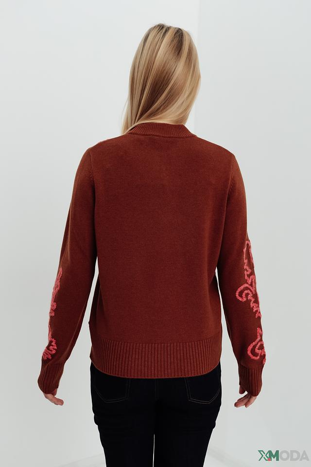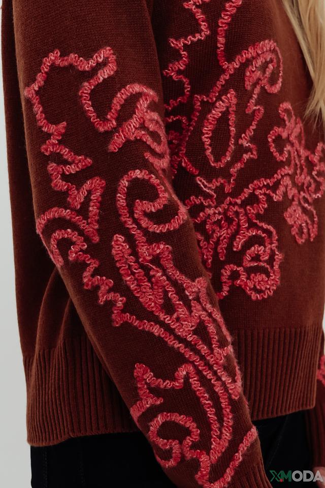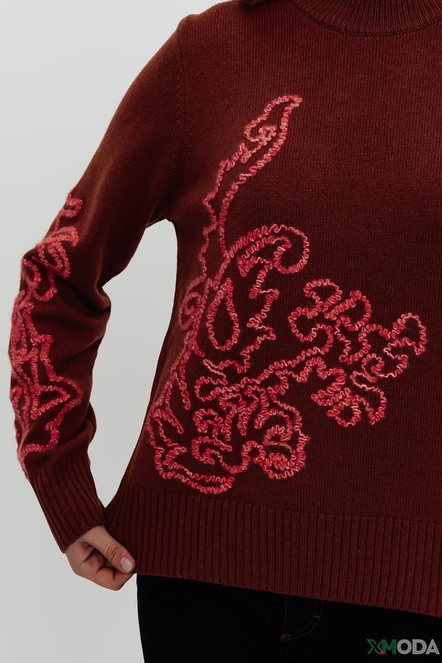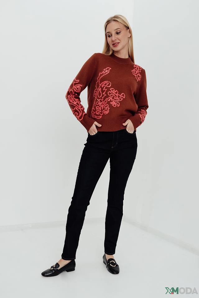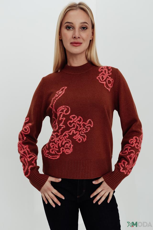 Этот джемпер от Penny Black выполнен в терракотовом цвете и украшен изысканной цветочной вышивкой. Модель имеет круглый вырез горловины и длинные рукава с манжетами.