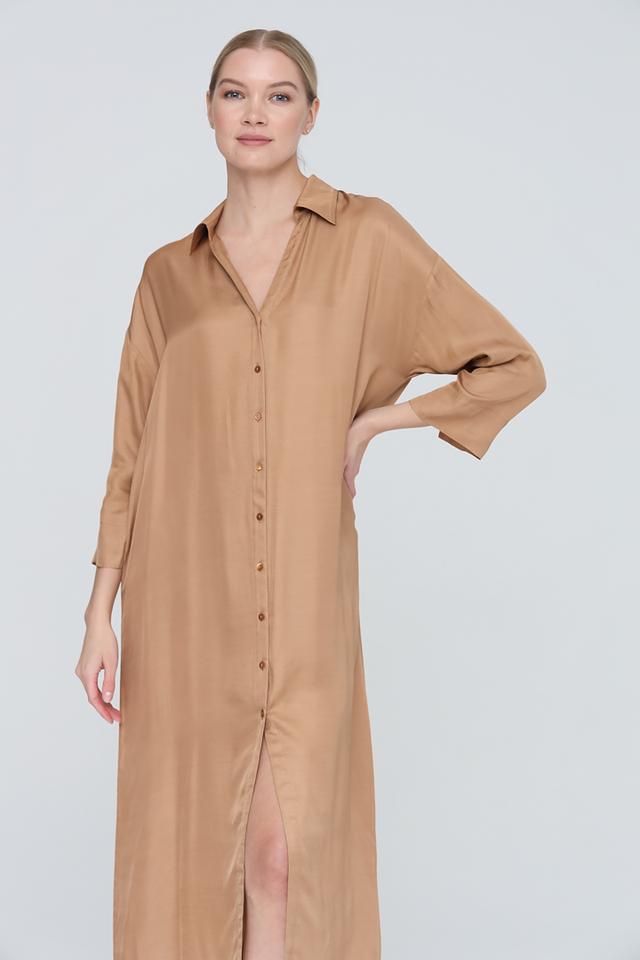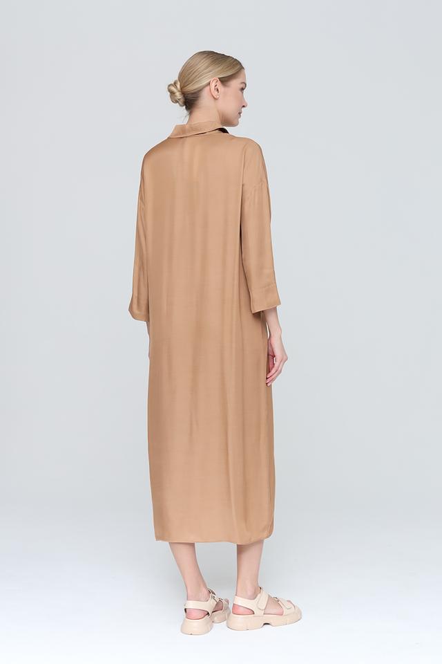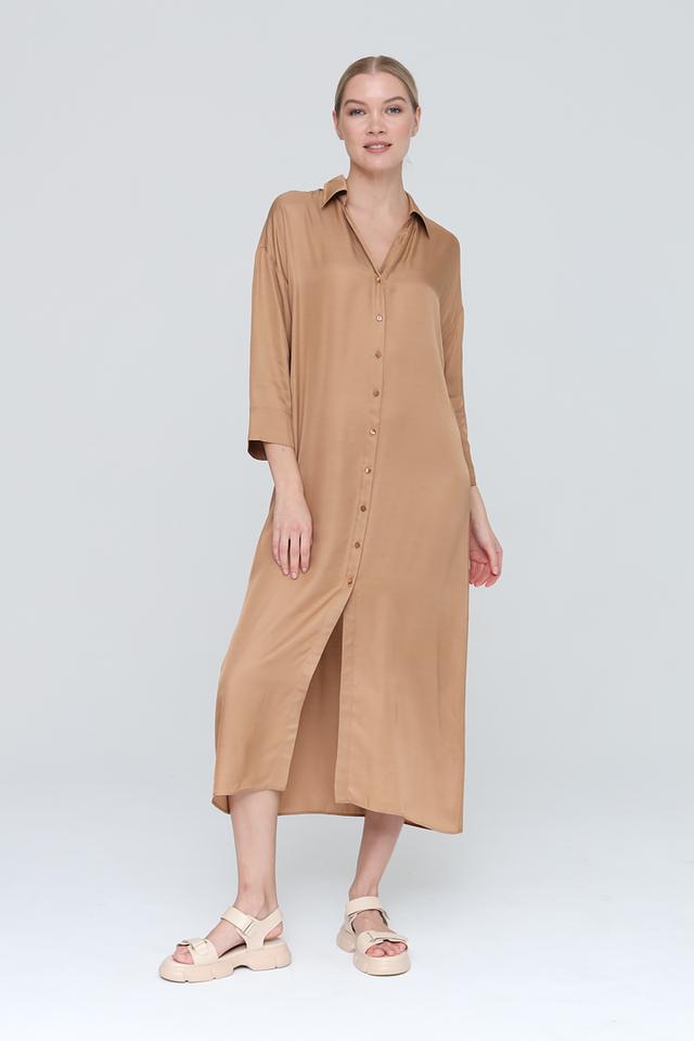 Это платье от Penny Black выполнено в бежевом цвете и имеет свободный крой, напоминающий рубашку. Модель отличается длиной миди и застежкой на пуговицы по всей длине, что позволяет регулировать степень открытости и создавать различные силуэты.