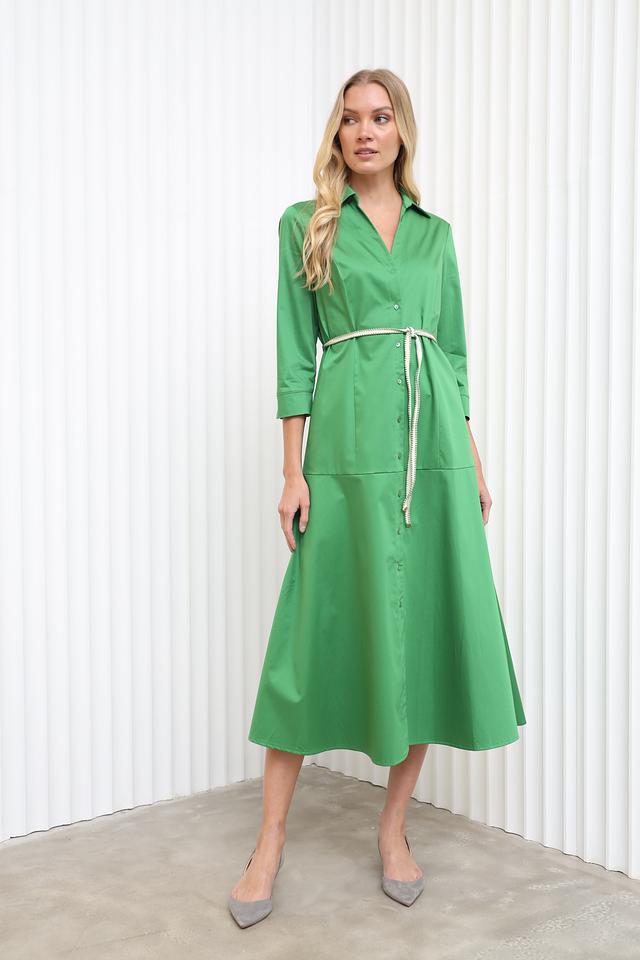 Модель имеет прямой крой, воротник рубашечного типа и застёжку на пуговицы по всей длине. Рукава длиной три четверти делают платье подходящим для тёплой погоды. Талию акцентирует съёмный пояс из ткани в тон, который можно завязать на бант или узел.