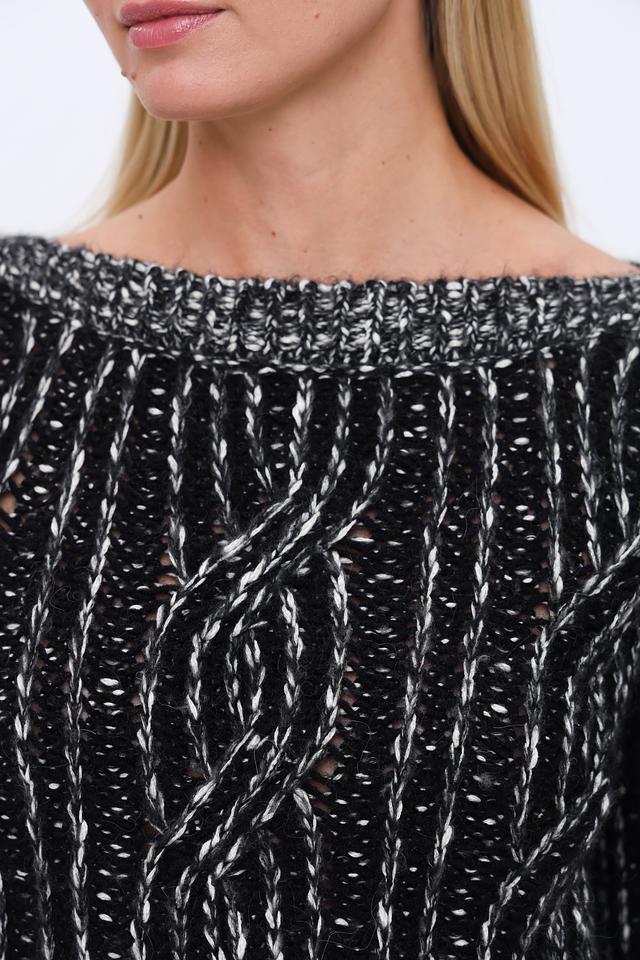 Чёрный джемпер Penny Black с выразительным узором из кос станет стильным дополнением к вашему гардеробу. Модель выполнена из мягкой пряжи с добавлением шерсти и альпаки, что обеспечивает комфорт и тепло. Состав: акрил 32%, хлопок 31%, шерсть 22%, нейлон 8%, альпака 7%