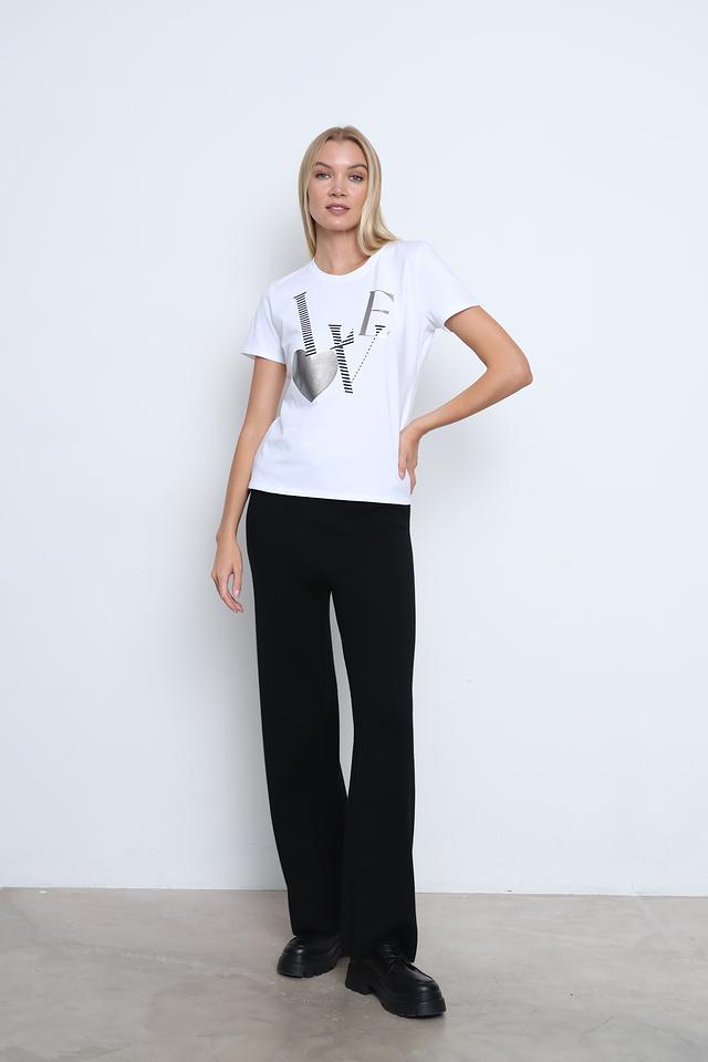 Основной цвет футболки – белый, что делает ее универсальной и легко сочетаемой с другими элементами одежды. Главная особенность модели – стильный принт "LOVE", выполненный в черно-серебристой гамме. Принт состоит из графических элементов и изображения сердца, что придает футболке современный и модный вид.