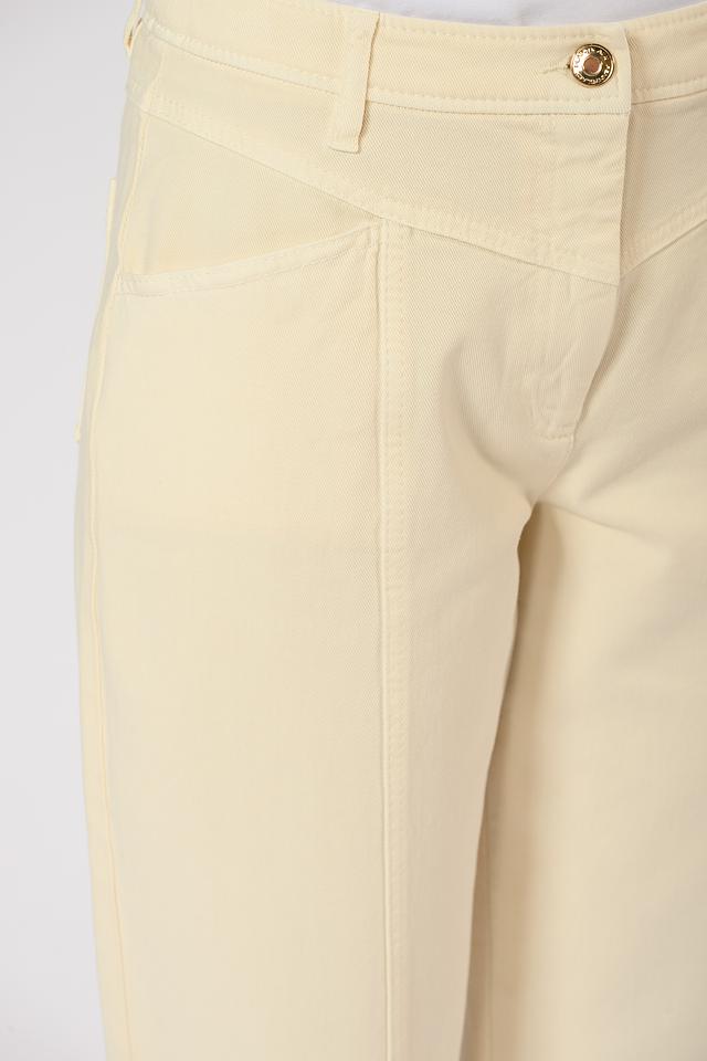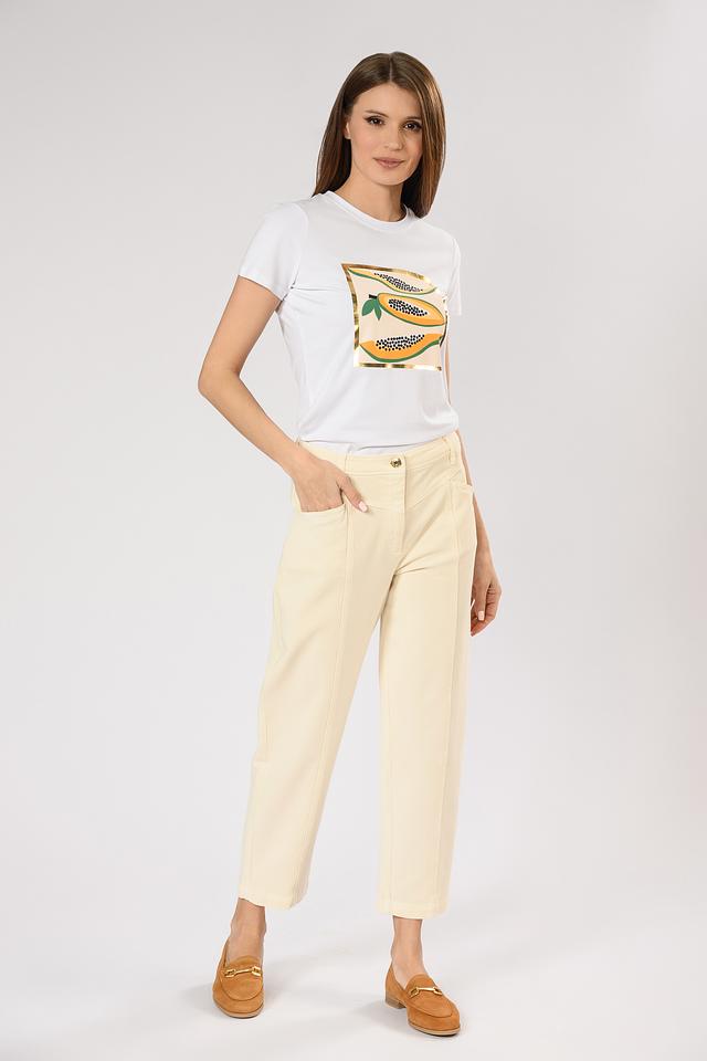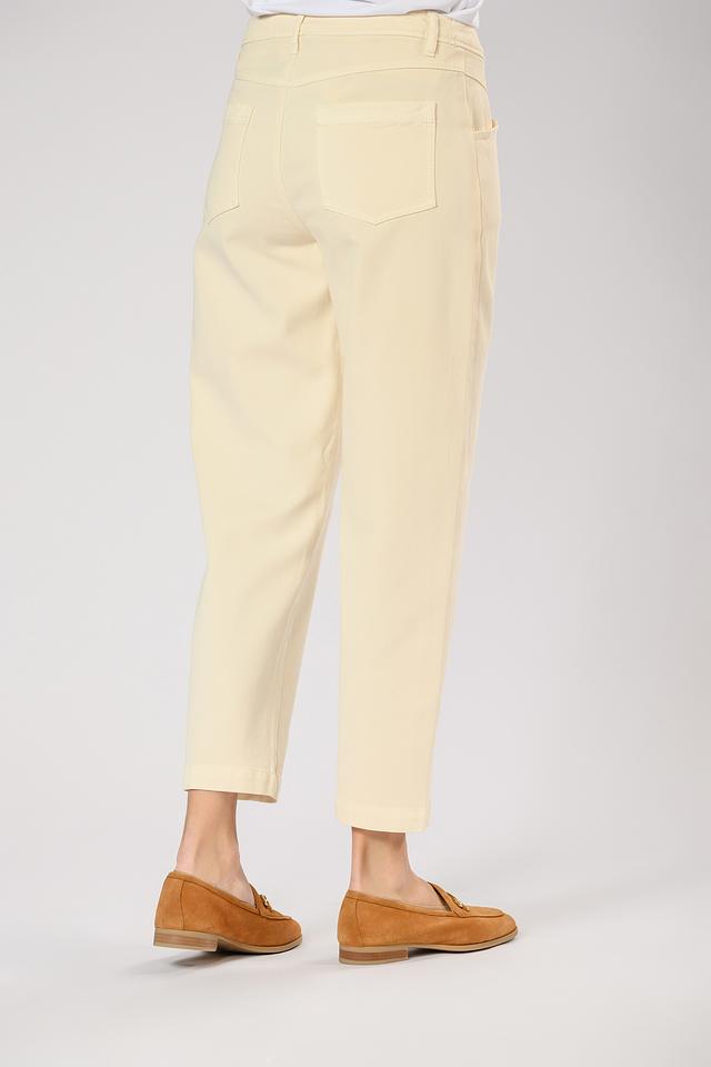 Брюки имеют завышенную талию, что визуально удлиняет ноги и создает более пропорциональный силуэт. Застежка на пуговицу и молнию обеспечивает надежную фиксацию. На брюках предусмотрены боковые и задние карманы.