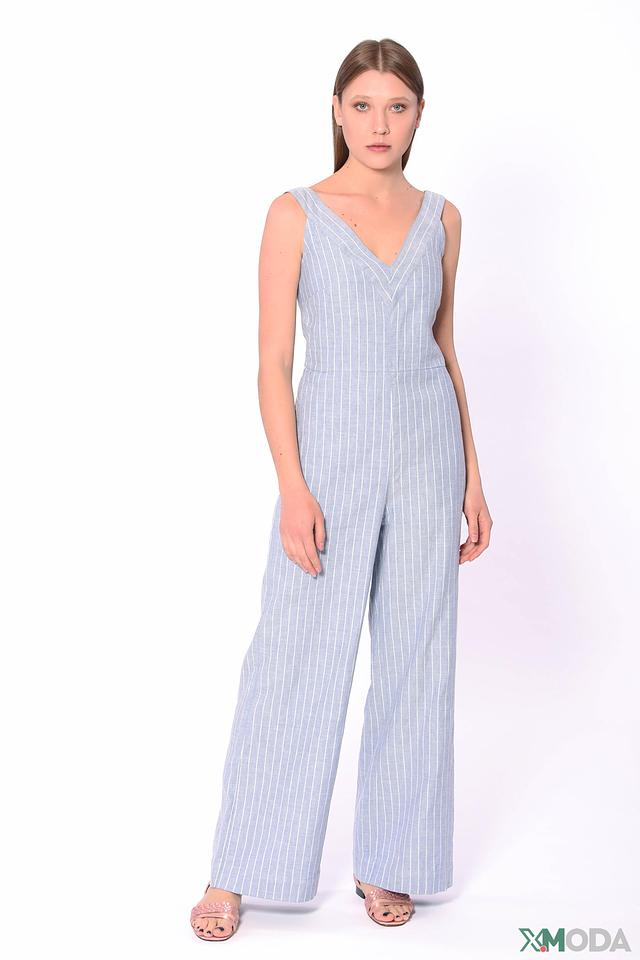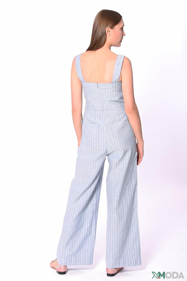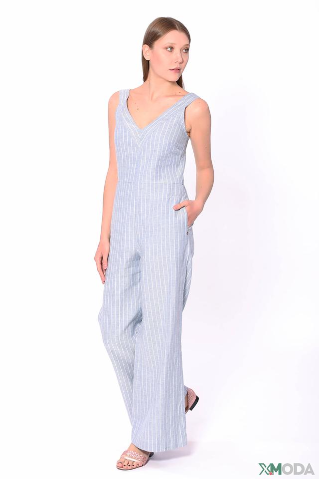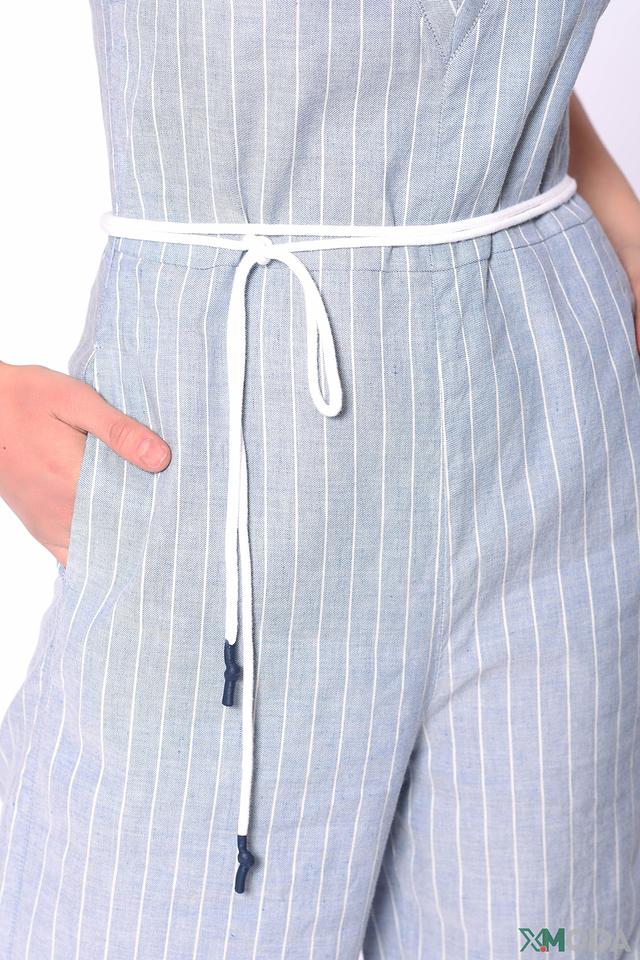 Вертикальная полоска голубого и белого цвета визуально вытягивает фигуру и придает комбинезону свежий и легкий вид. Наличие боковых карманов добавляет практичности. Этот комбинезон идеально подойдет для повседневной носки, прогулок по городу или летних вечеринок.