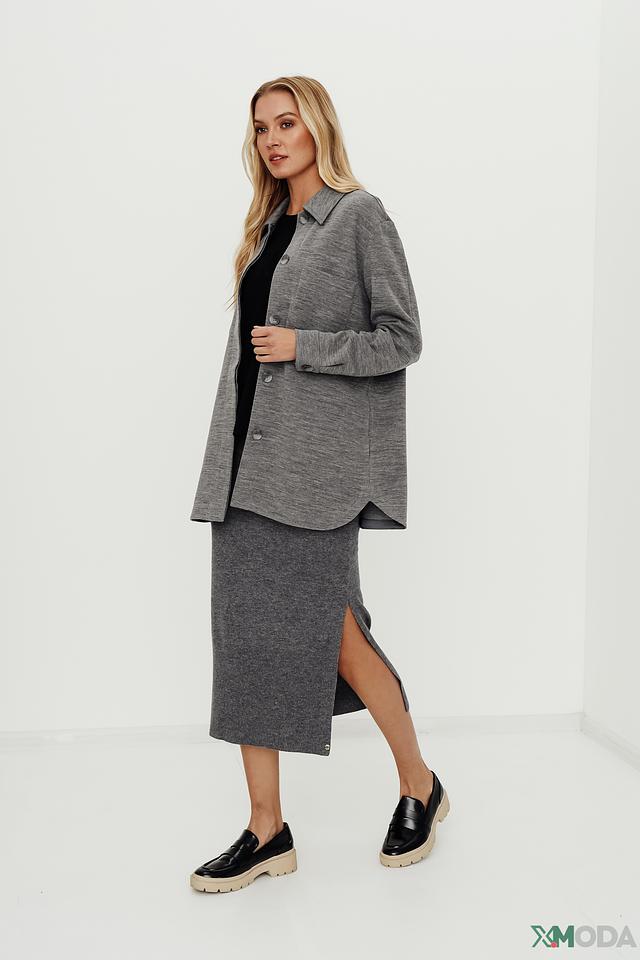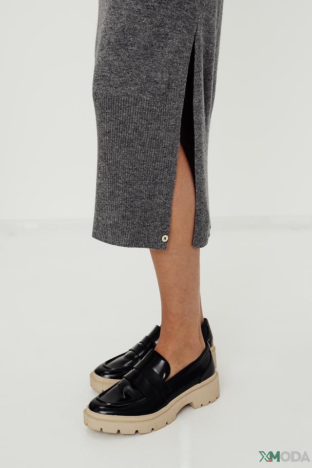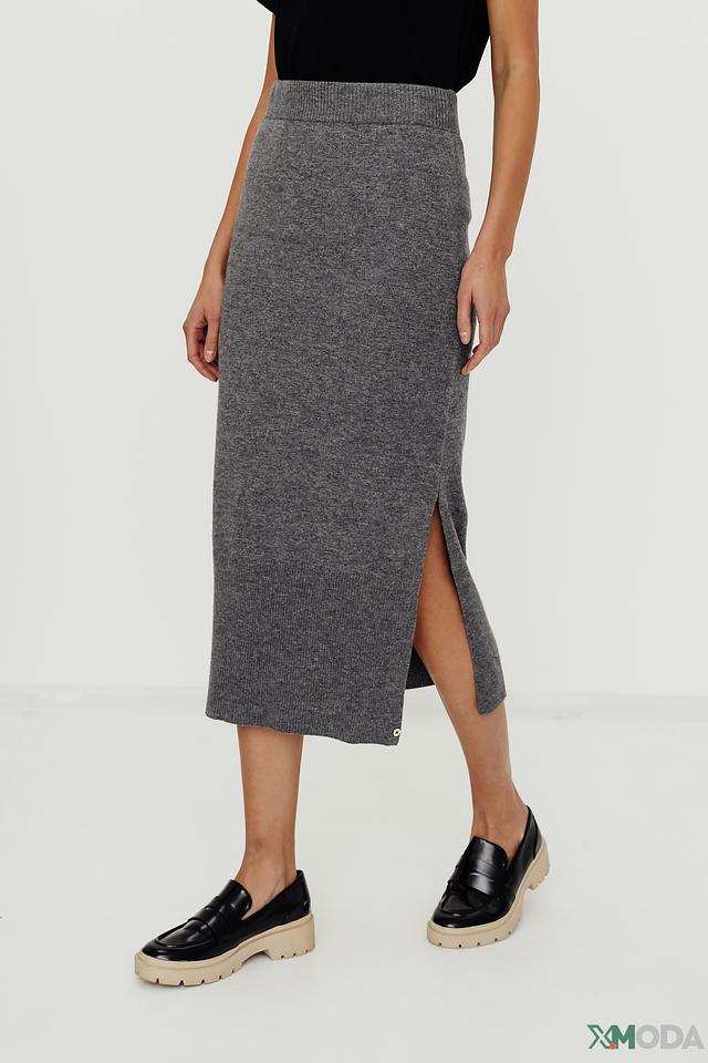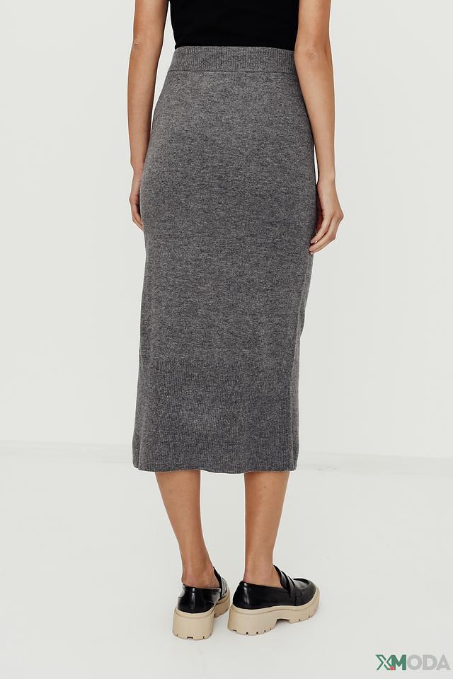 Юбка имеет классический серый цвет и выполнены в виде вязаного полотна. Модель отличается приталенным силуэтом и длиной миди, что делает ее универсальной для различных случаев. Небольшой разрез сзади добавляет образу легкости и динамики.
