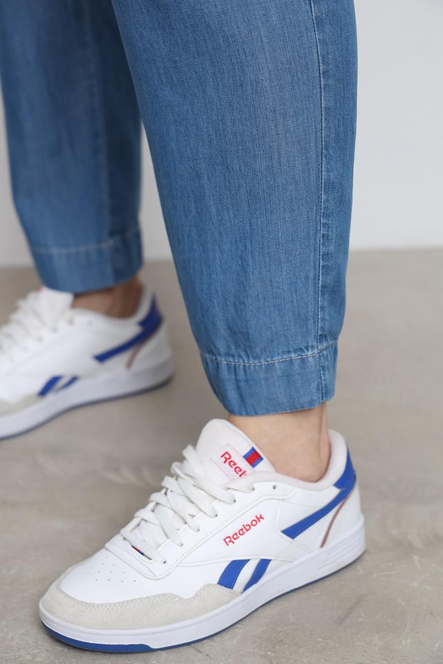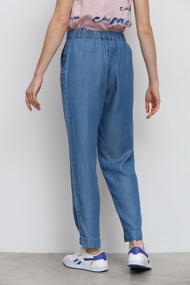 Джинсы имеют классическую посадку на талии с эластичной резинкой и шнурком, что позволяет регулировать облегание. По бокам расположены удобные карманы. Застежка выполнена на пуговицу.