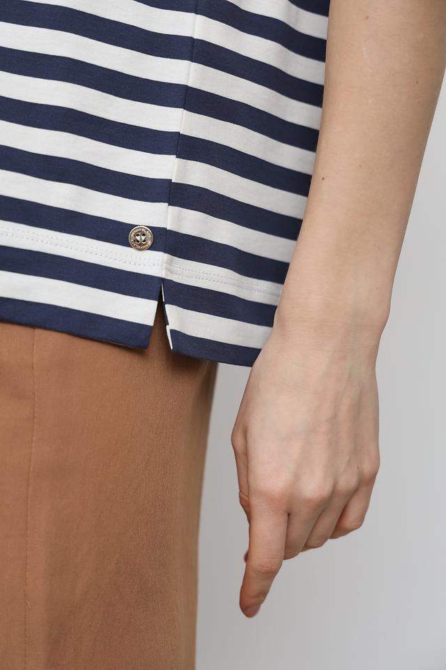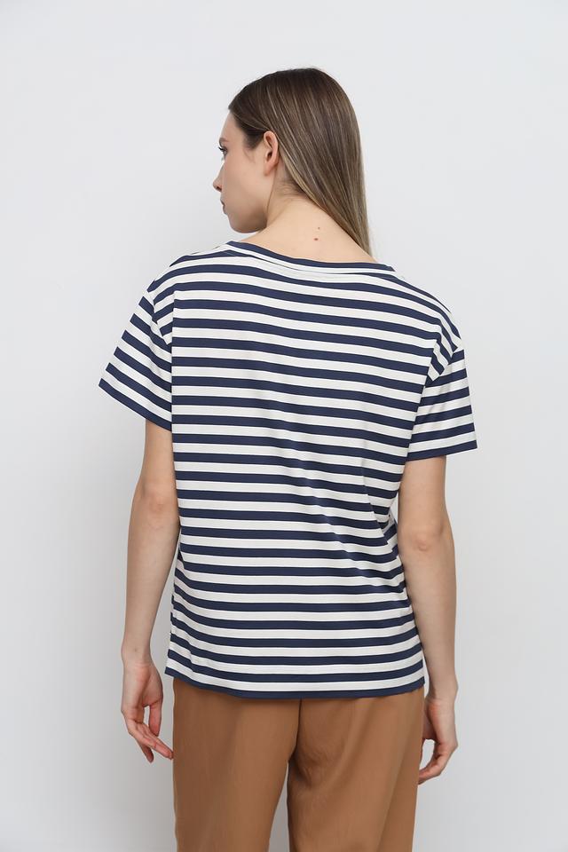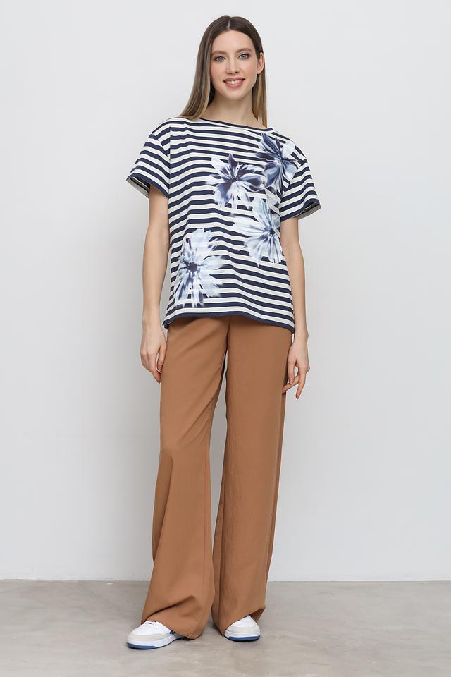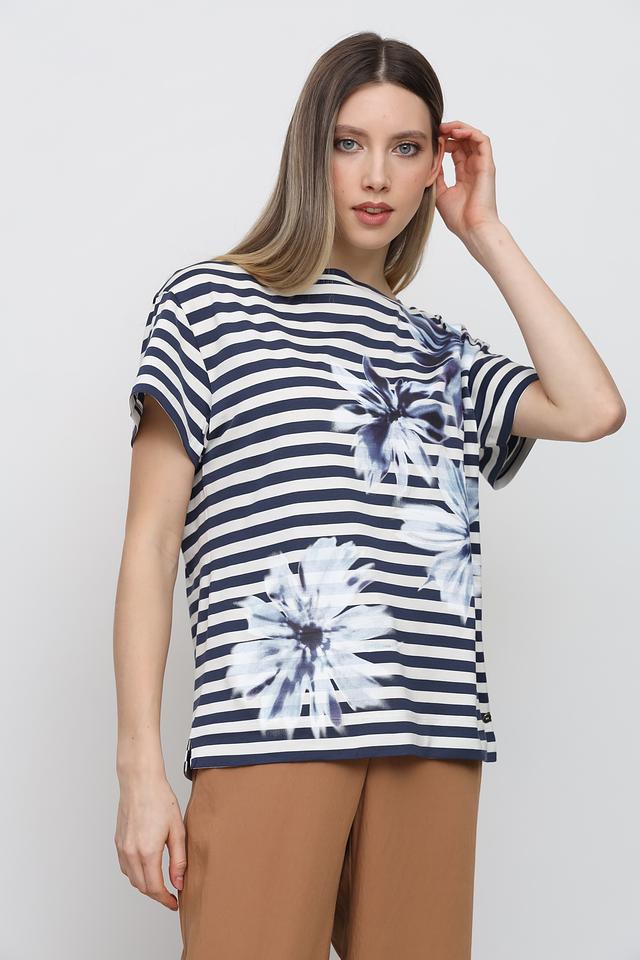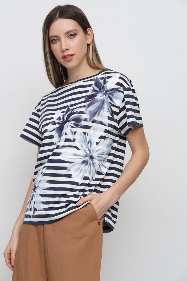 Футболка выполнена в классическом сочетании синего и белого цвета в виде горизонтальных полос. Оригинальный цветочный принт добавляет образу женственности и легкости.
