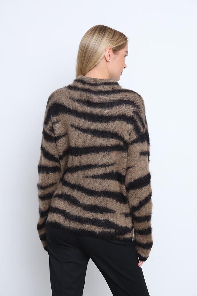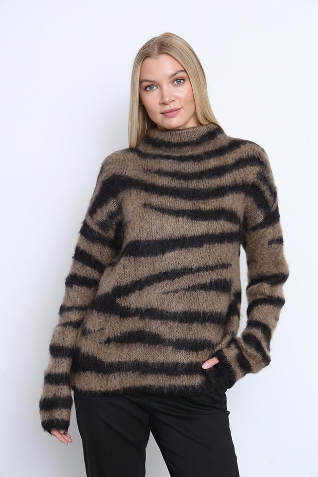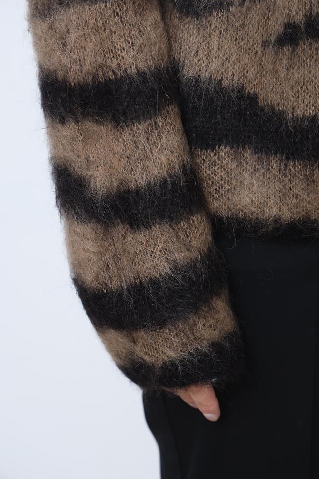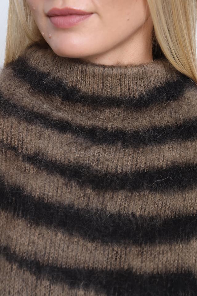 Джемпер имеет свободный крой и высокий горловину, что делает его идеальным для прохладной погоды. Коричневая основа с черными полосами создает эффектный и современный образ. Текстура пряжи с мохером придает джемперу объем и мягкость.
