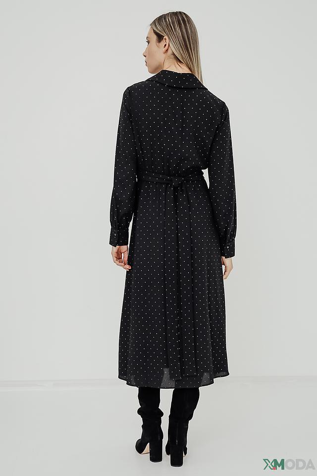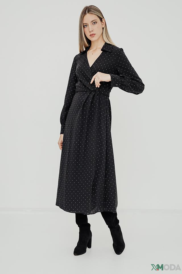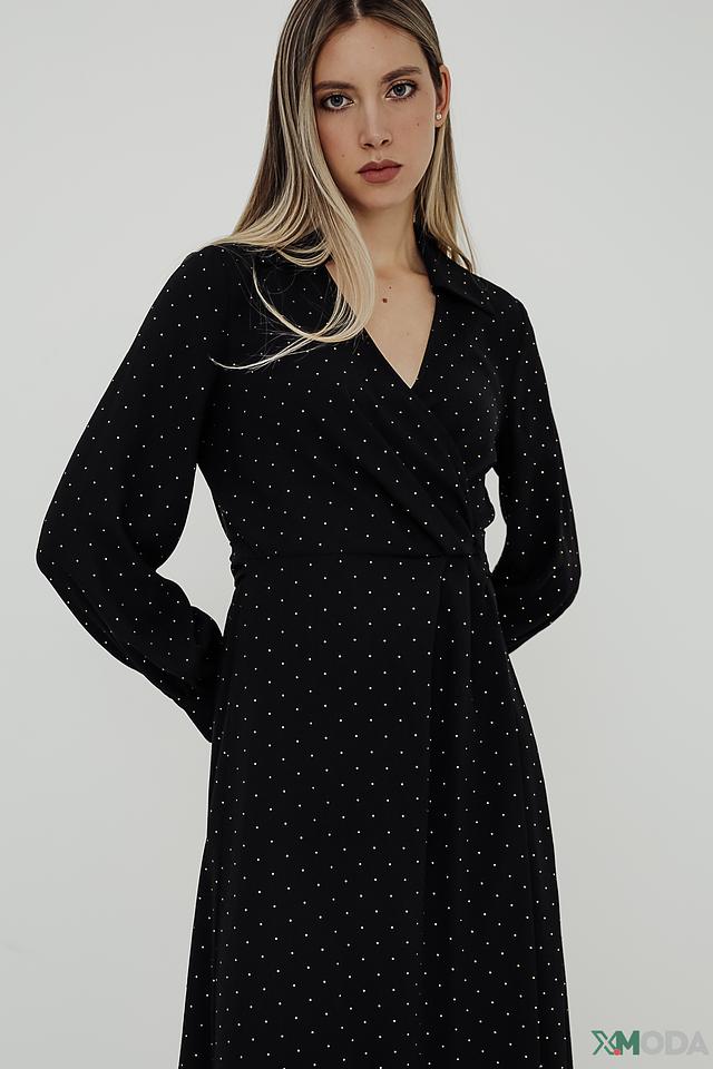Чёрный цвет с мелким белым горошком делает это платье универсальным и подходящим для различных случаев – от повседневной носки до особых мероприятий. Сочетайте его с ботильонами или туфлями на каблуке, чтобы создать завершенный образ.