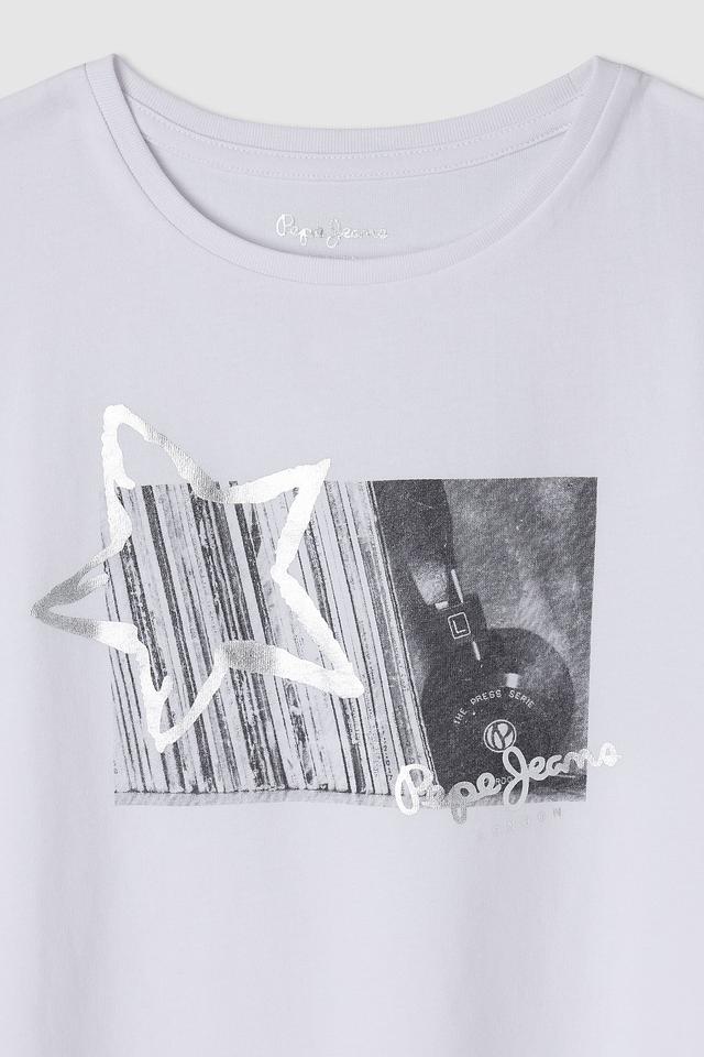 Детская футболка Pepe Jeans London белого цвета с оригинальным графическим принтом. Изготовлена из 100% хлопка, обеспечивающего комфорт и воздухопроницаемость. Стильный и удобный вариант для повседневной носки. Состав: хлопок 100%