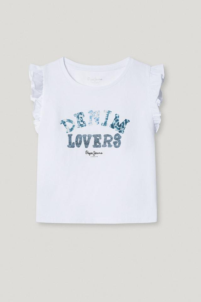 Белая футболка Pepe Jeans London для девочки с оригинальным принтом "Denim Lovers". Модель выполнена из 100% хлопка, имеет короткие рукава с оборками и удобный крой. Состав: хлопок 100%