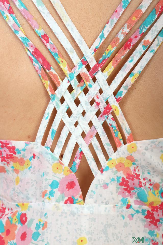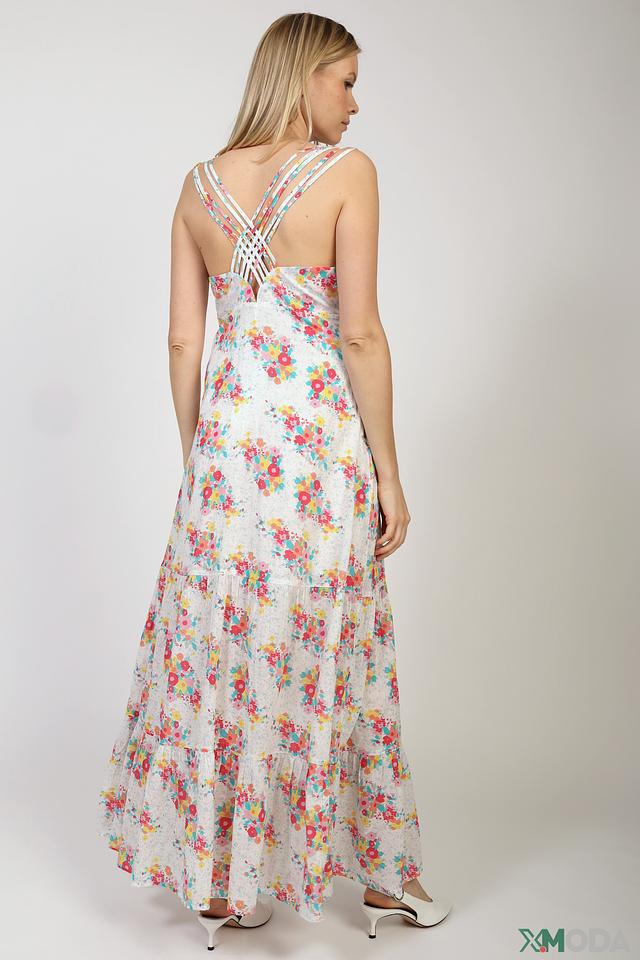 Платье имеет длину макси, свободный силуэт и V-образный вырез. Тонкие бретельки переходят в оригинальную спинку с плетением, добавляя образу изысканности. Юбка платья выполнена в стиле ампир с оборками, что придает ему легкость и воздушность.