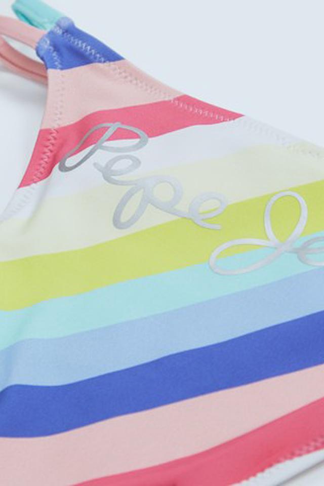 Представляем стильный и удобный раздельный купальник от бренда Pepe Jeans London, предназначенный для юных модниц. Купальник выполнен в яркой полосатой расцветке, сочетающей в себе оттенки синего, розового, жёлтого и белого.